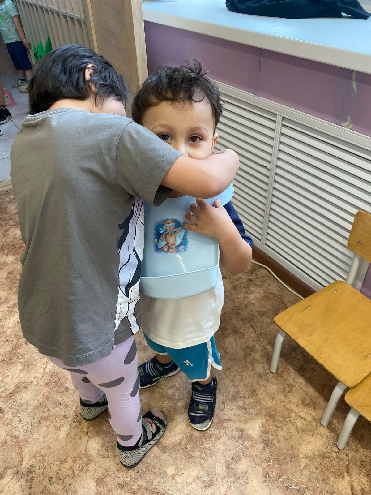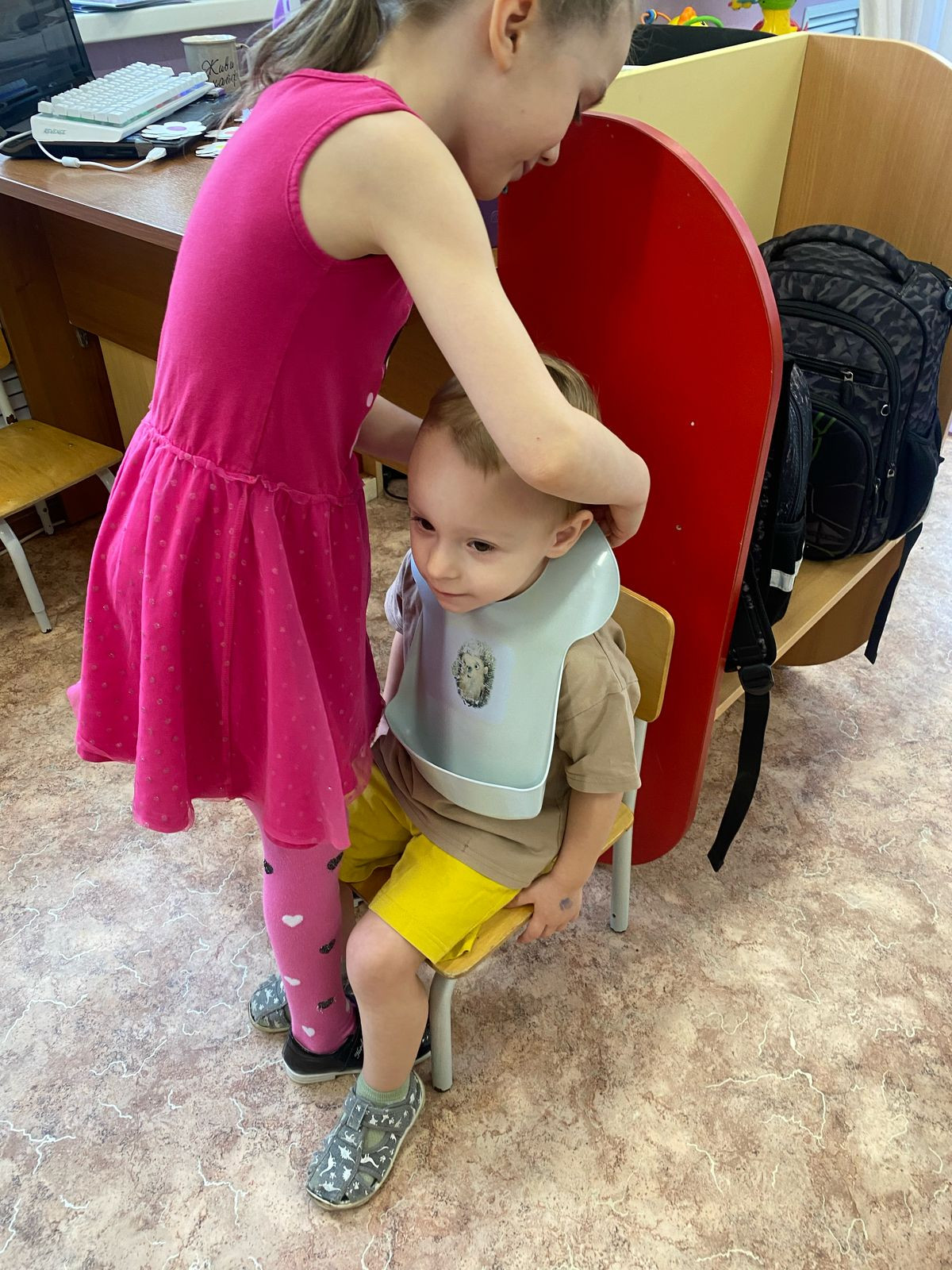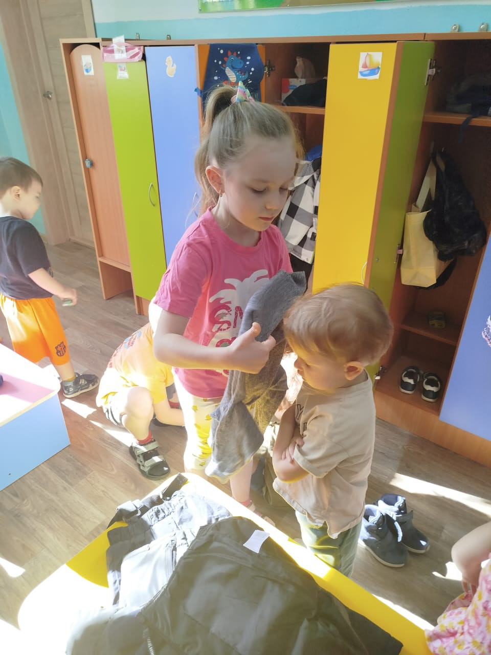 С каждым днем становится все больше замечательных моментов, когда старшие ребята помогают ясельным детям: одеваться на прогулку, накрывать на стол, надевать на них слюнявчики, читают пере сном, помогают убрать игрушки на свои места.