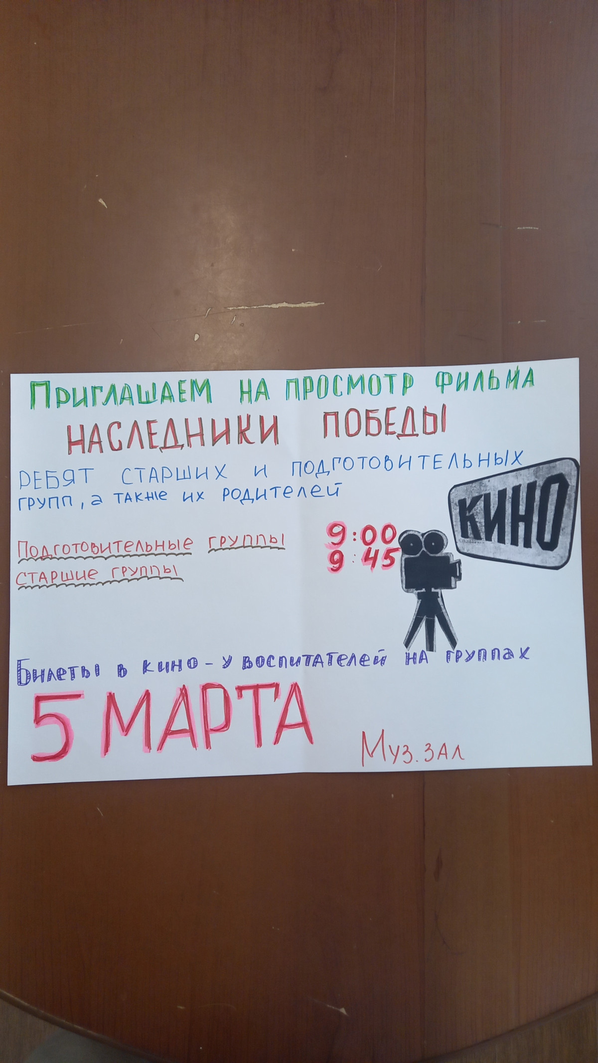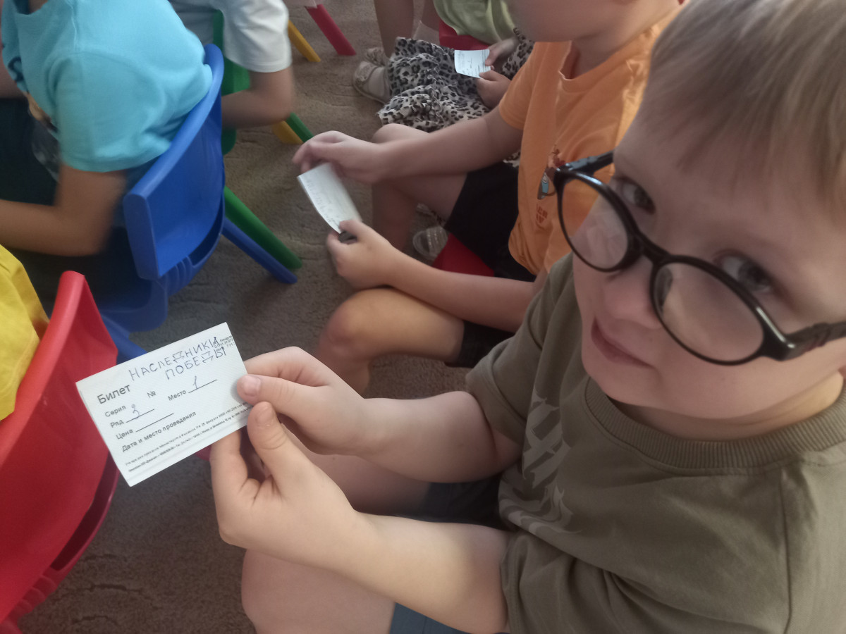 В нашем детском саду №44 г. Владивостока прошел замечательный день, когда ребята подготовительной группы с нетерпением ожидали просмотра фильма «Наследники победы». Подготовили заранее музыкальный зал, создав в нем атмосферу настоящего кинотеатра, появились ряды и места, были «куплены» билеты на сеанс и всех ребят на входе встречал билетер.