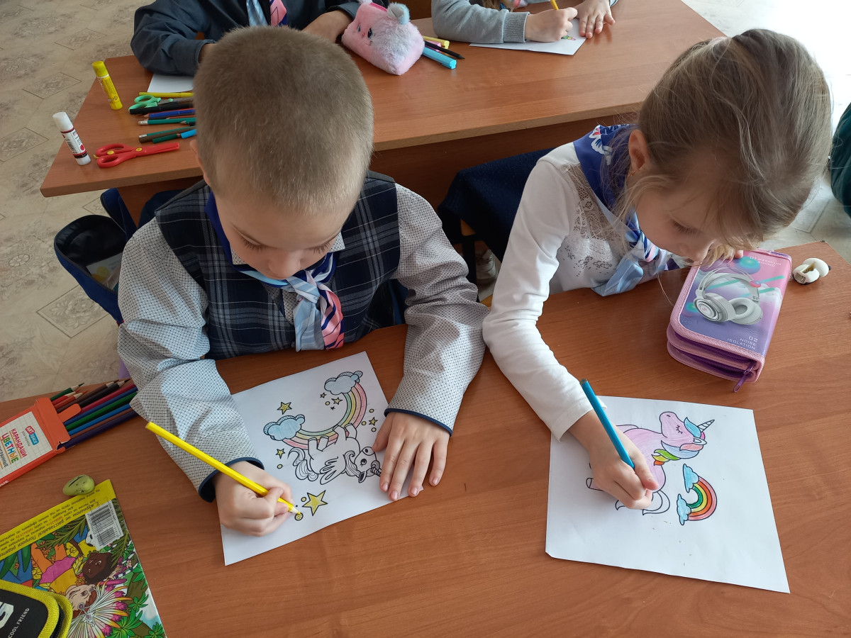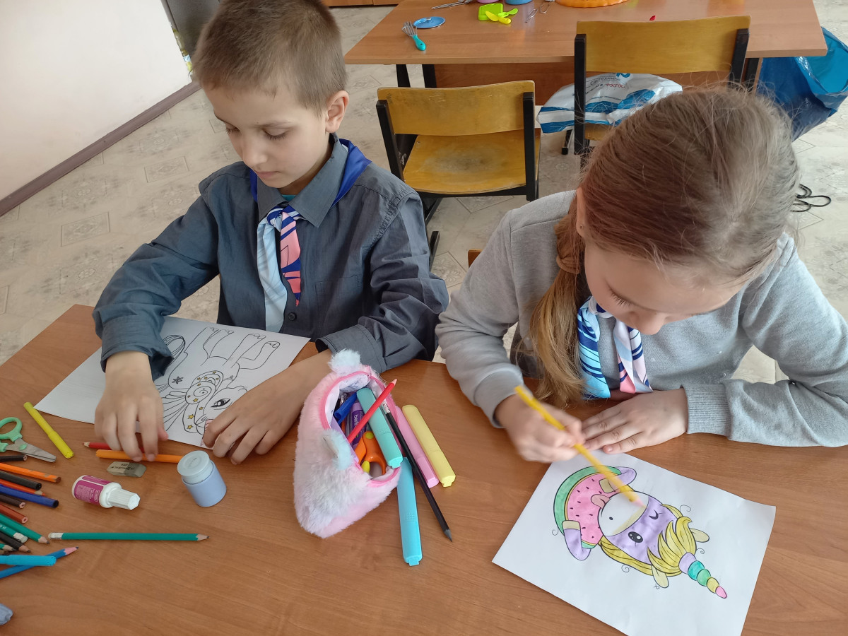 Ребята получили помощь от старшеклассников, провели игру на сложение коллектива. Затем нарисовали единорога так, как представляют его. Обменялись рисунками между собой и подарили своим вожатым.