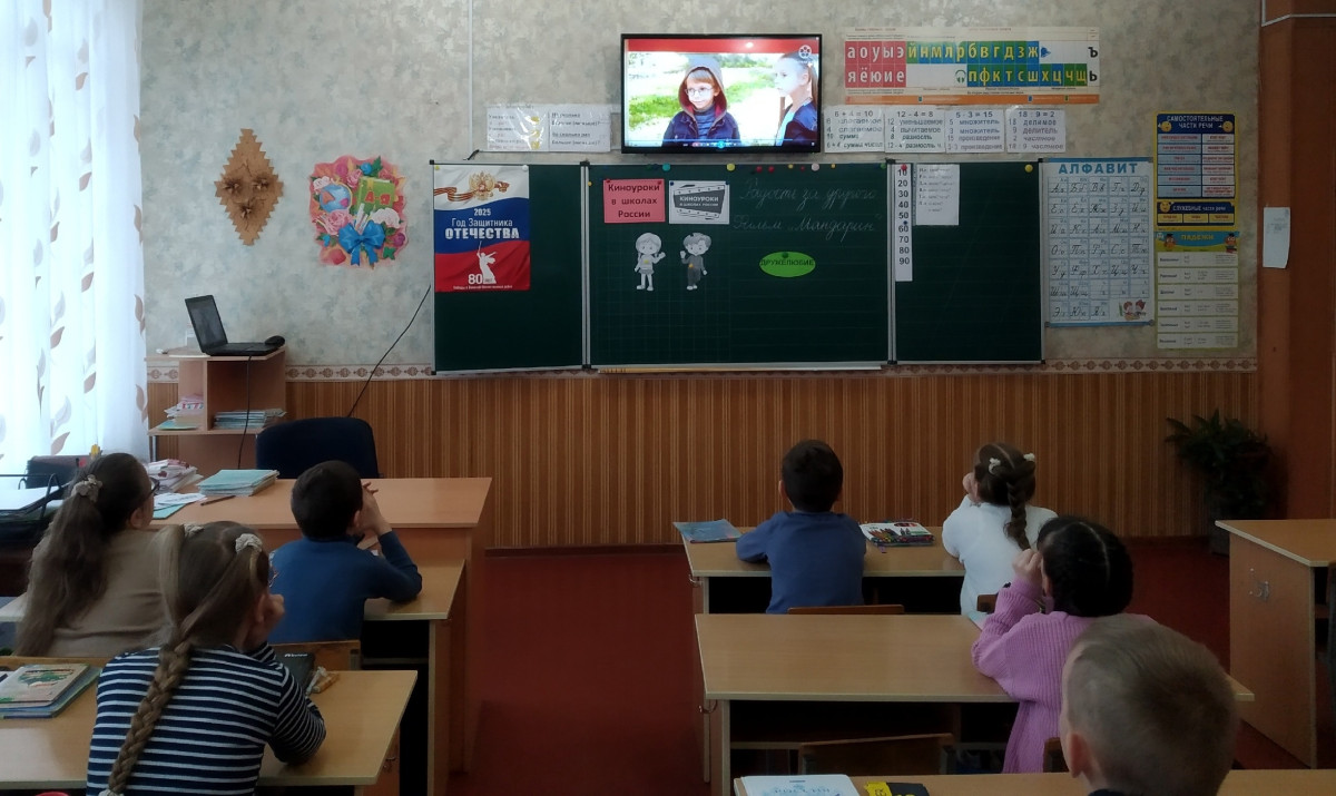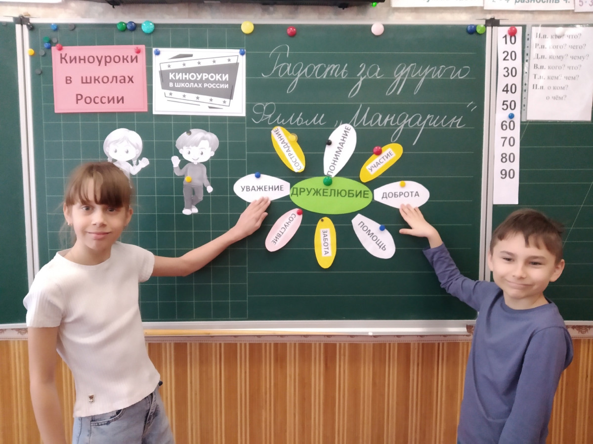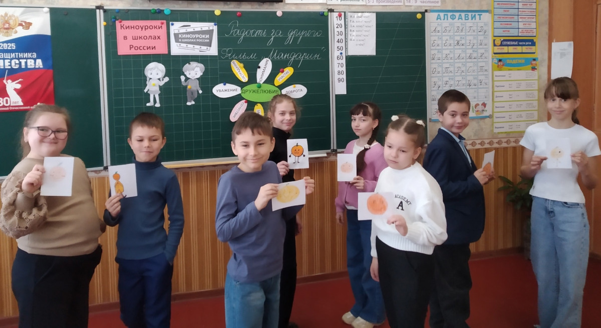 В рамках проекта «Киноуроки в школах России» учащиеся 3-А класса ГБОУ «СШ № 18 Шахтерского м.о» посмотрели и обсудили фильм "Мандарин». Кинофильм дети смотрели с большим интересом. Они увидели, как простой мандарин стал причиной настоящей дружбы, победившей зависть и обиду. Ребята совместно пришли к выводу, что важно уметь радоваться успехам других. После просмотра и обсуждения фильма были проведены игры на сплочение коллектива, также ребята проявили инициативу нарисовать свои мандаринчики, написать пожелание другу. Ребята обменялись нарисованными мандаринчиками.