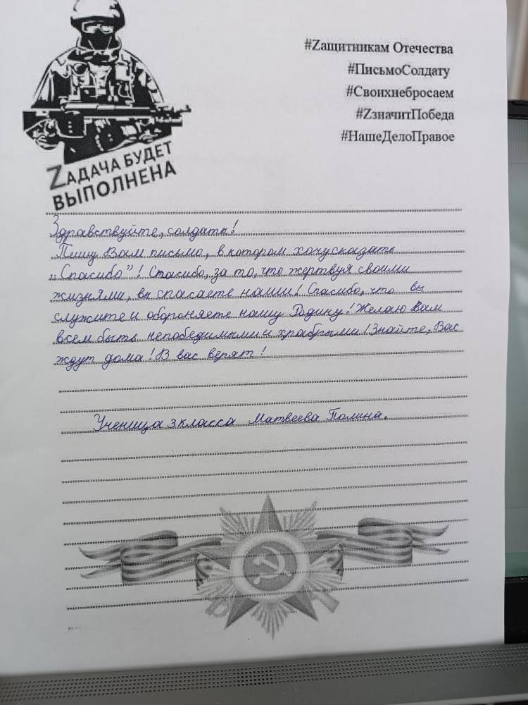 После просмотра состоялось обсуждение фильма, который затронул всех и никто не остался равнодушным. Ребята поделились своими мыслями и примерами. Мы также обсудили, как можно исправить свои ошибки и почему это важно. Дети осознали, что смелость не только в том, чтобы не бояться, но и в том, чтобы признавать свои ошибки. То, что дети сумели рассказать о своих недостойных поступках и сожалели о них – это уже смелость. Ради этого стоить смотреть киноуроки! Вдохновившись фильмом, дети решили написать письма солдатам-землякам, которые находятся на СВО. Для участников специальной военной операции очень важна поддержка их родных, друзей и соотечественников. Вдвойне приятно получать теплые и воодушевляющие слова от детей. Школьники решили отправить военным письма, поблагодарив их за то, что они покинули свои дома ради защиты Родины. Тексты получились искренними и невероятно трогательными