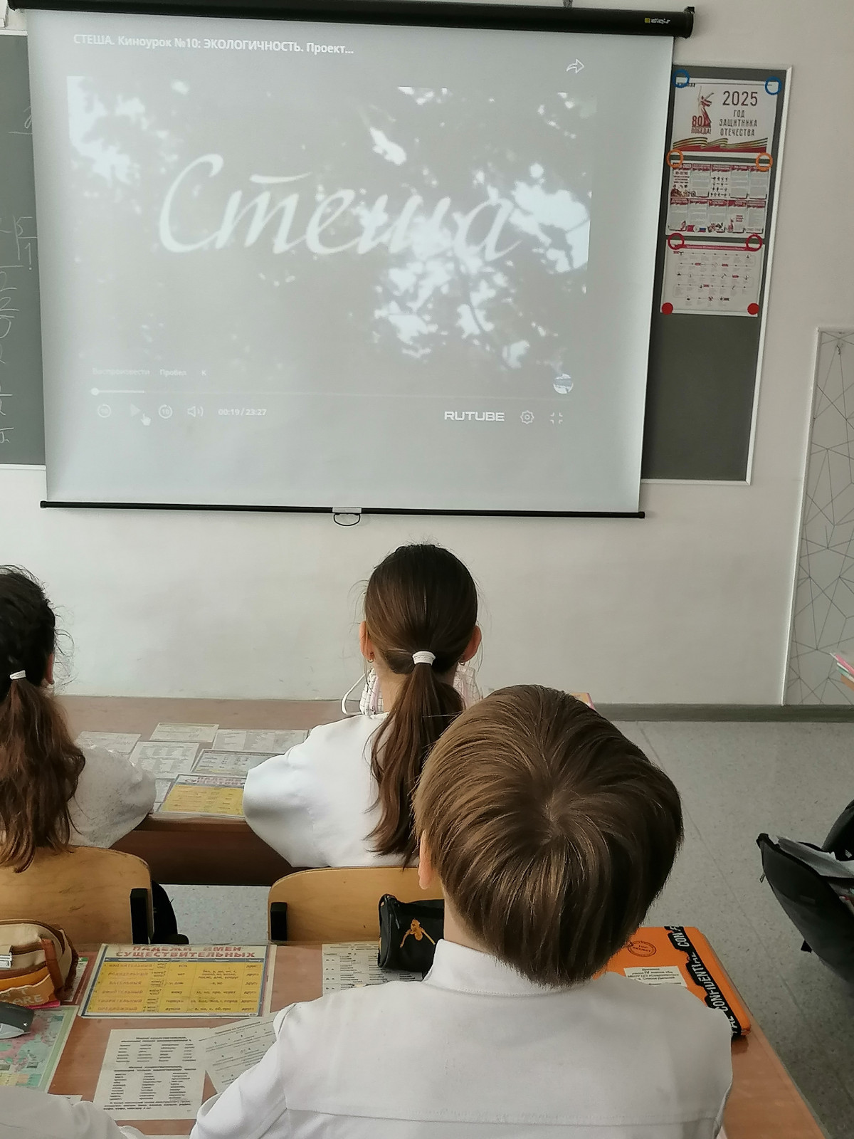 Ученики 4 "Б" класса посмотрели фильм «Стеша». После просмотра фильма учащиеся активно обсуждали увиденное, выражая свои эмоции и впечатления. Наш киноурок был направлен на формирование у учащихся экологического сознания, любви к природе и чувства ответственности за окружающую среду. Идея проведения практики возникла в связи с наблюдаемой недостаточной заинтересованностью учащихся экологическими проблемами и низким уровнем экологической культуры. Учитель предложила детям подумать, как они могут помочь окружающей среде, пусть маленьким, но важным делом. Дети предложили убрать территорию вокруг школы. Развитие нравственного качества «экологичность» проявлялось в активном участии детей в обсуждении проблемы, а также в их желании принять участие в этой акции. Дети попросили родителей купить им перчатки и мусорные пакеты и вышли на уборку.В результате проведённой социальной практики уровень экологической грамотности учащихся повысился. Ребятам было приятно, когда их хвалили прохожие. Дети получили удовлетворение от того, что они принесли практическую пользу. Проведённая социальная практика показала высокую эффективность использования киноуроков в целях экологического просвещения и формирования экологической культуры у школьников. Активное участие детей в практических мероприятиях способствовало не только повышению их экологических знаний, но и развитию таких важных нравственных качеств, как ответственность и трудолюбие .