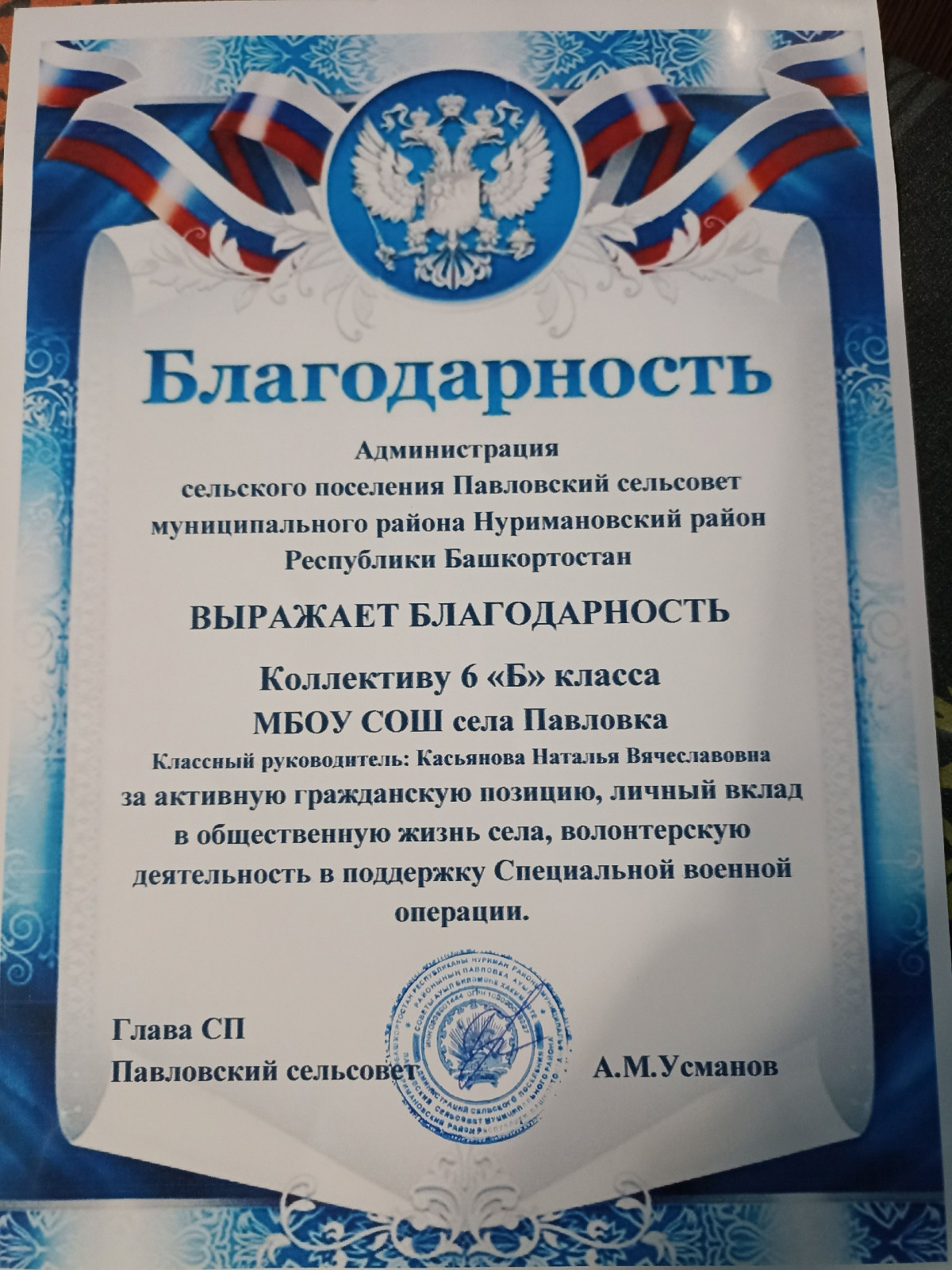 Фильм "Счастливые люди" оказал на нас с ребятами большое впечатление. После просмотра данного фильма ребята задумались, что мы можем сделать такого, что будет действительно важно и принесет пользу. При обсуждении ребята пришли к выводу, что подвиг-это мужественный, храбрый поступок человека, который ради спасения других жертвует собой. Сегодня в нашей стране есть такие люди. В зоне СВО бойцы ежедневно совершают подвиг, защищая страну. Учащиеся 6Б класса проявили инициативу, предложили принять участие в волонтерском движении "Надежда", которое оказывает помощь и поддержку участникам СВО реальными делами. Из нашего села немало мужчин находятся на боевом посту. Нас обучили волонтеры, жители нашего села, подсказывали, советовали. Мы в течение трех месяцев плели сети, маскировочные шлемы для нужд СВО. Осознание того, что сеть, или маскировочный шлем, маскировочная штора реально спасут чьи-то жизни, наполняет наши сердца чувством радости и истинного счастья. Наши сети уже отправлены по месту назначения, кроме этого, ребята изготовили маленькие игрушки-обереги своими руками, для наших героев, в каждую поделку, каждое письмо мы вложили частичку своей души. Эта совместная деятельность обладает воспитательным эффектом. Ребята осознали себя частью общего целого. В подростковом возрасте важно осознавать себя значимым и счастливым. Результатом нашей работы стало новое осознание ребятами понятия "счастье"- приносить пользу. https://vk.com/wall-98205159_4550 https://vk.com/wall-102032420_13533 https://vk.com/wall-195709729_1796