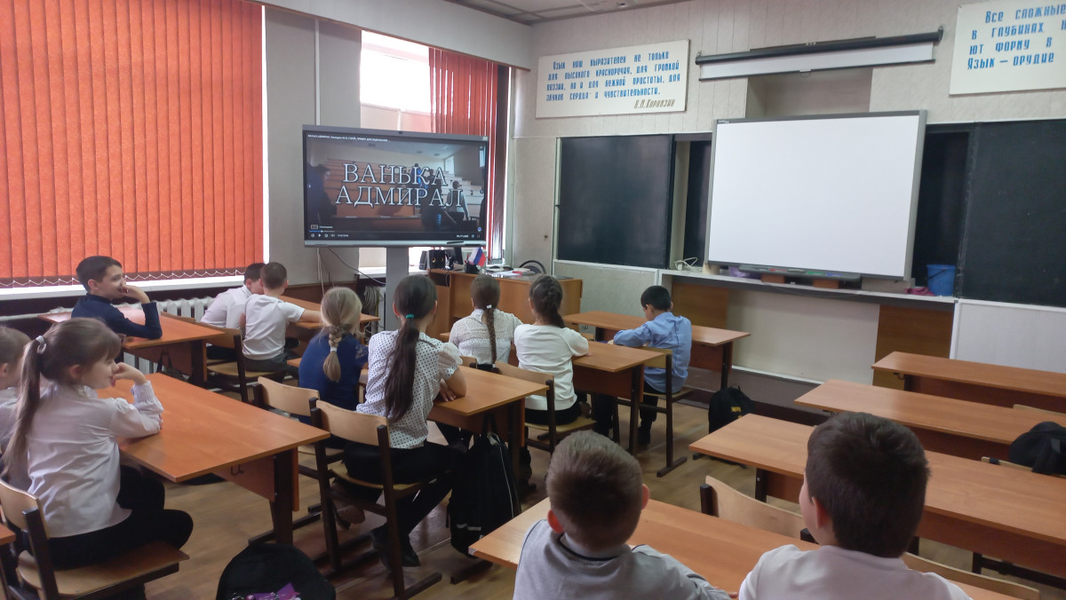 В преддверии празднования 80-летия Победы в Великой Отечественной войне, в рамках Всероссийского проекта «Киноуроки в школах России» для обучающихся 3 «Б» класса был показан короткометражный художественный фильм «Ванька-адмирал». На примере главного героя фильма - Ивана, подростки познакомились с такими качествами как: героизм, отзывчивость, доброта, дружба, взаимовыручка, стойкость, самоотверженность. А так же ребята узнали, что в это году исполняется 280 лет со дня рождения русского адмирала Ф.Ф. Ушакова.