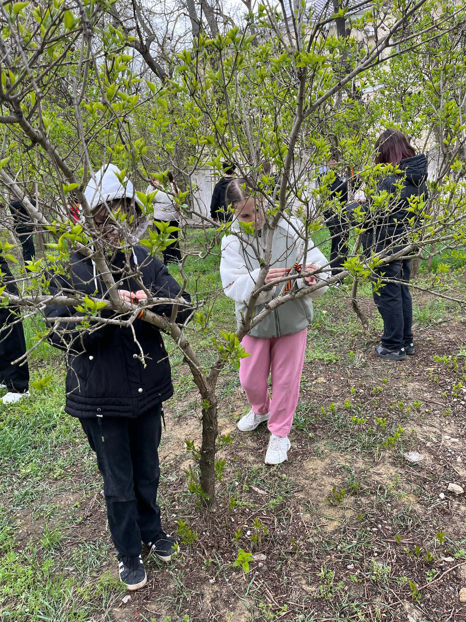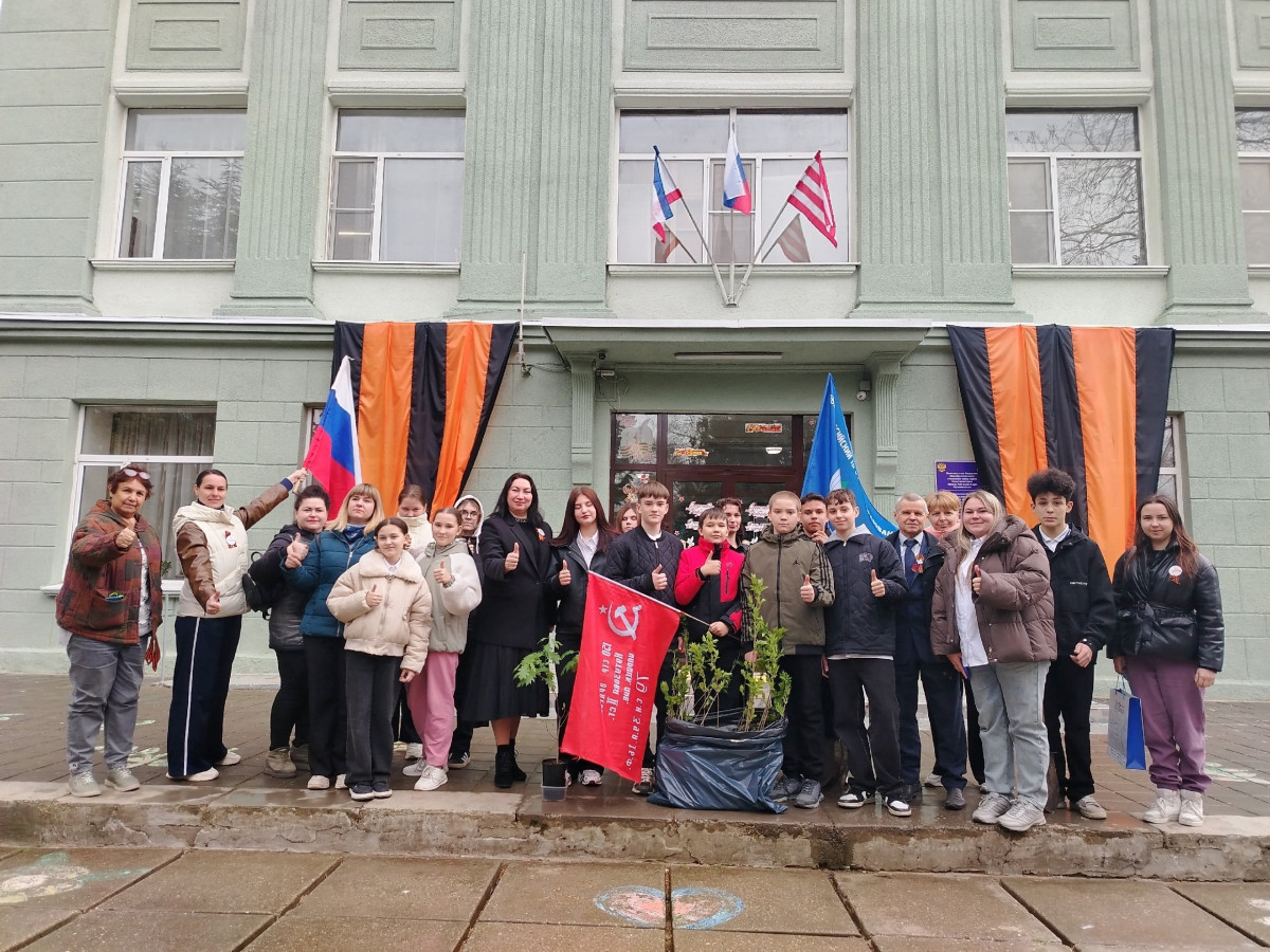 Обучающиеся 9-Б класса в сиреневой аллее Сада повязали георгиевские ленты как символ мира и памяти о подвиге наших предков.