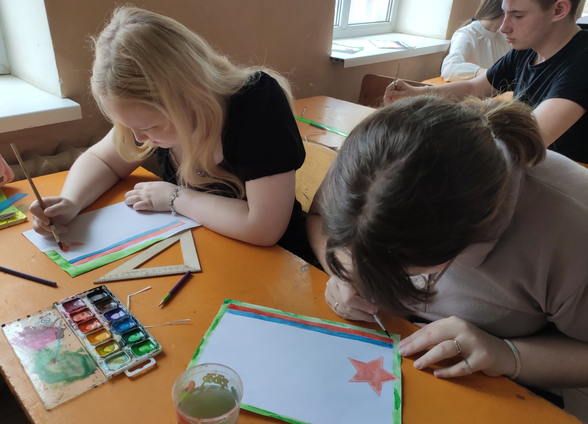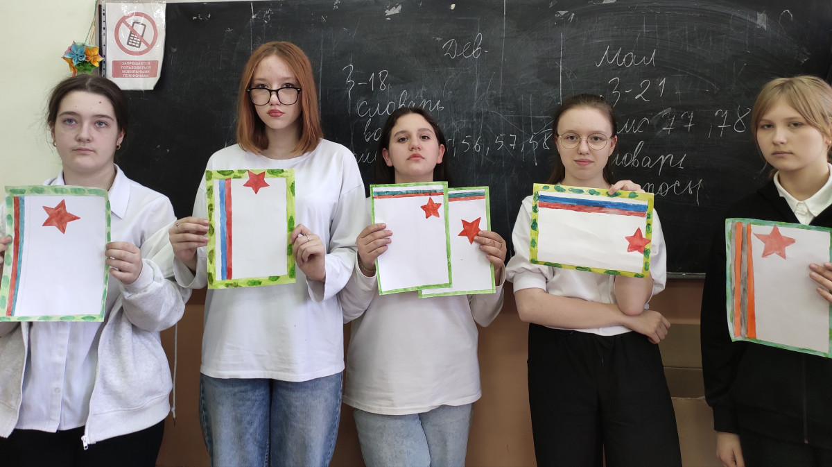Ребята решили подготовить красочные бланки для написания писем солдатам СВО. На бланках изобразили символы победы. Потом на этих бланках написать письма ,чтобы поддержать наших бойцов.
