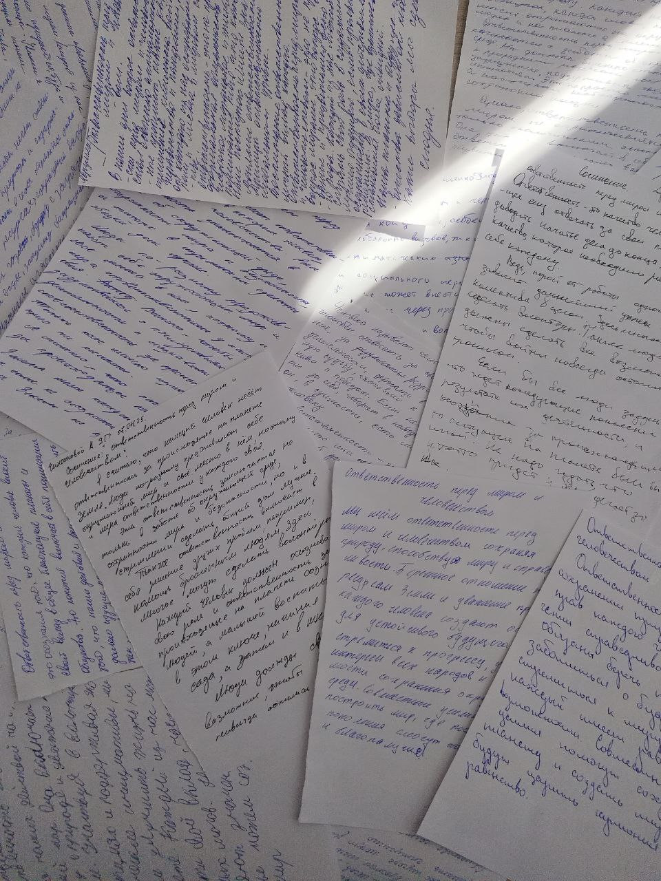 После просмотра киноурока "Там, где мечтают медведи", который предложил посмотреть педагог, для обучающихся возник вопрос: "В чем был смысл фильма?". И все ребята пришли к единому мнению, что темой фильма является "ответственность перед миром и человечеством". Учеников заинтересовал этот термин и они стали предлагать варианты того, что такое ответственность. Ребята проявили инициативу и предложили друг другу написать мини-сочинение "Что такое ответственность перед миром и то такое ответственность перед человечеством". После того, как каждый ученик выступил со своим сочинением и рассказал одноклассникам о том, что в его понимании ответственность перед миром, ребята коллективно поддержали выступающих аплодисментами.