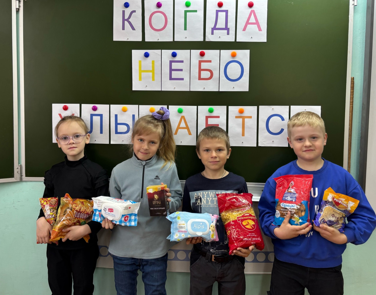 В качестве социальной практики первоклассники решили принять активное участие в сборе гуманитарной помощи бойцам СВО ко дню Победы.