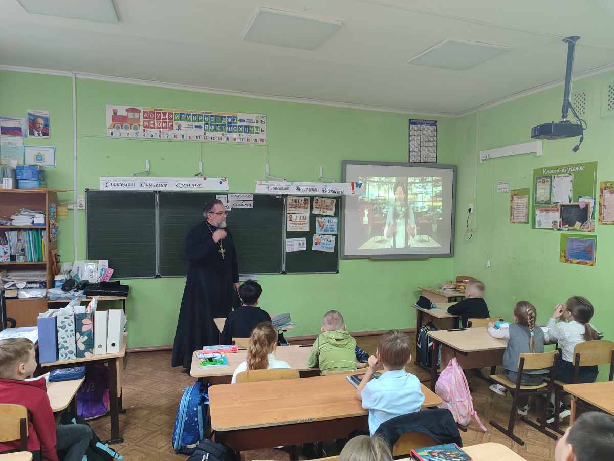 Отец Александр рассказал ребятам о взаимоотношениях в семье, о том, что любовь к своим ближним нужно воспитывать, прежде всего, в семье. Сделал акцент на том, что в первую очередь нужно любить и уважать своих родителей и своих наставников, то есть учителей.