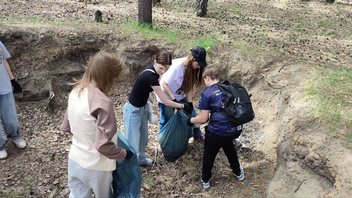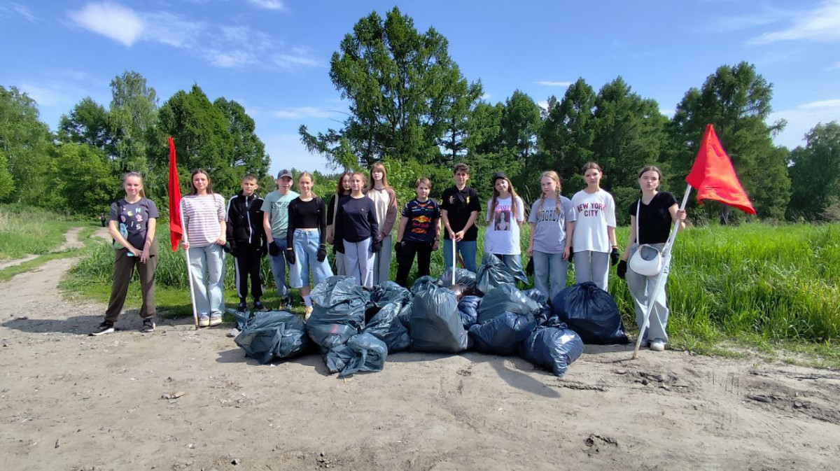 Экологические волонтеры, уборка берега около реки Иня