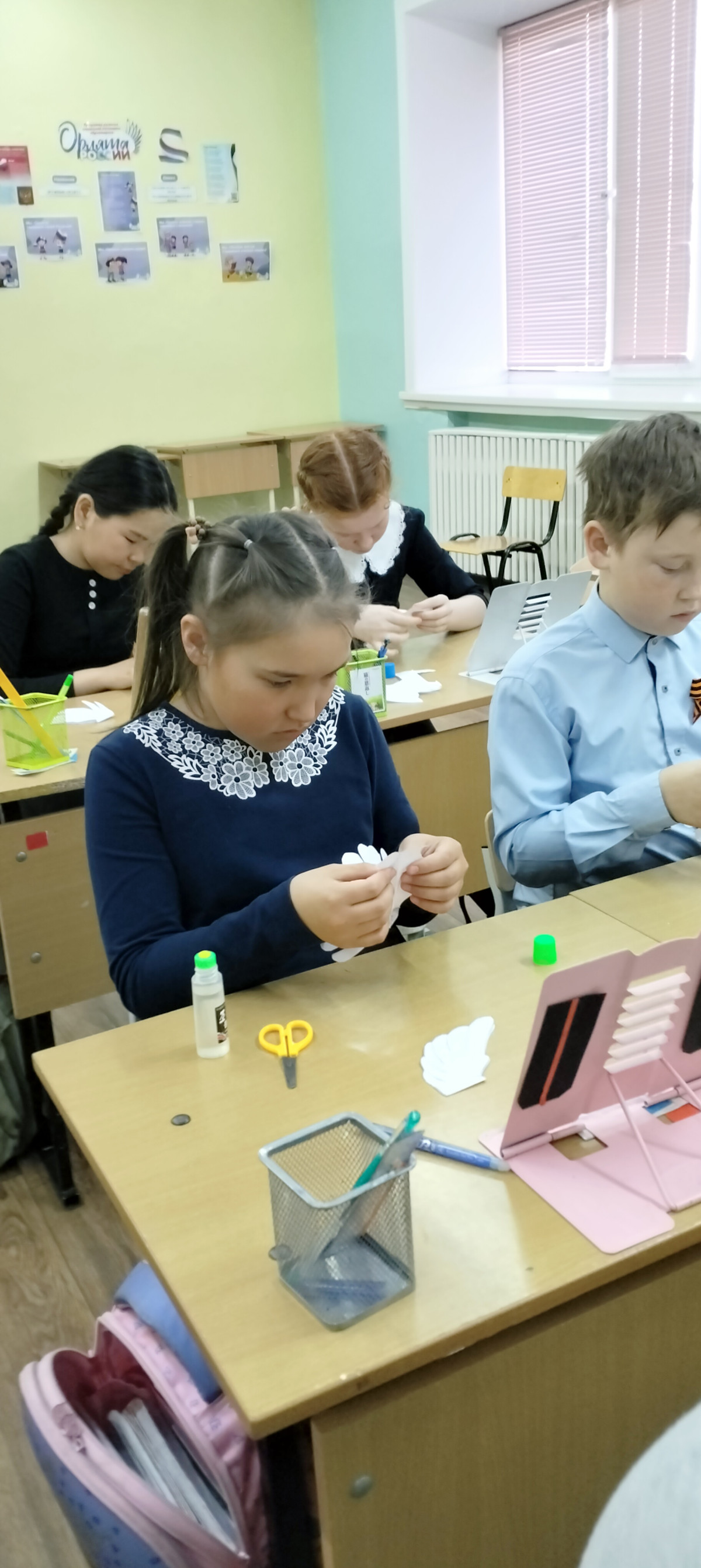 В заключение обсуждения обучающимися выбирается деятельность для социальной практики. В нашем классе существует давняя традиция: в преддверии праздника 9 Мая изготавливать «символ мира» - голубя, а затем на торжественном митинге у Мемориала дарить его с добрыми пожеланиями односельчанам: бывшим труженникам тыла, детям войны, представителям общественных организаций ветеранов, волонтеров, представителям воинской части, поэтому социальная практика была посвящена ей.