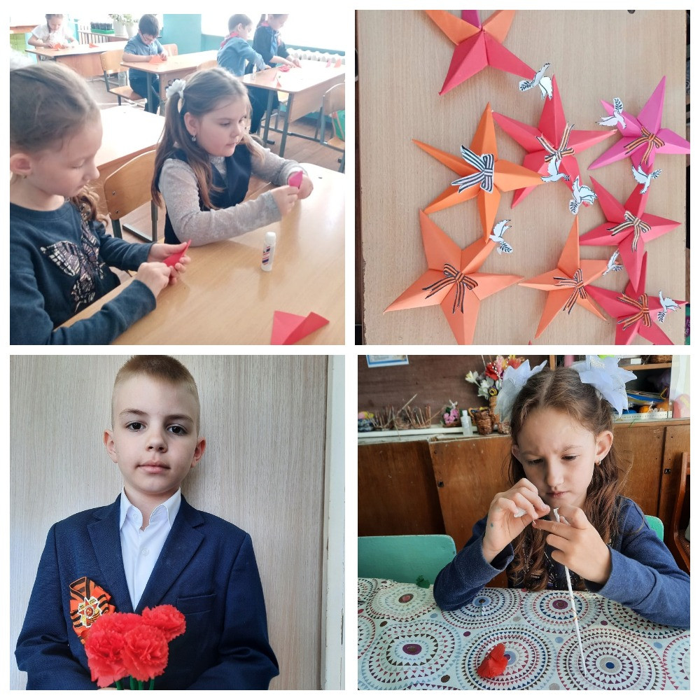 5. Вместе с педагогами дополнительного образования Дасаевой Э.К. и Семовой Ю.В. к празднику Великой Победы труженикам тыла смастерили звездочки, открытки, флажки и гвоздики.