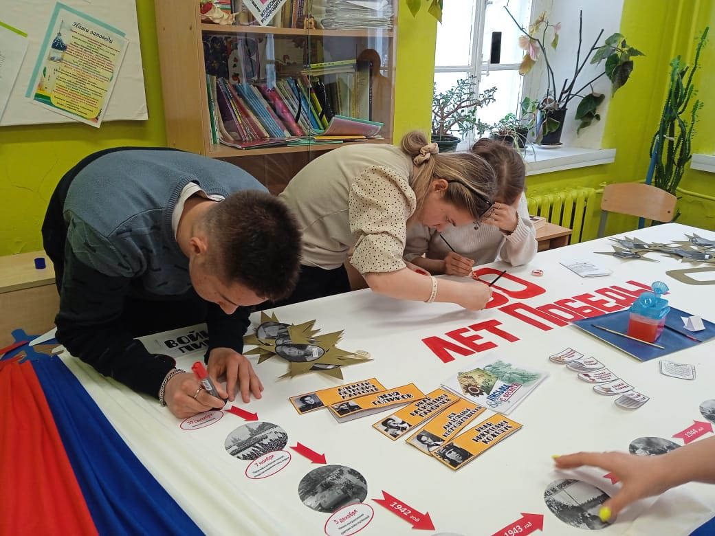 В ходе обсуждения учащиеся, совместно с учителями, решили создать уникальную информативную стенгазету, посвященную празднованию 80-летия Победы в Великой Отечественной войне. Учащимися была собрана информация о важных событиях, героях войны, о том, как прошли эти непростые годы. Чтобы сделать уголок по-настоящему трогательным и патриотичным, участники искали исторические факты, рисовали иллюстрации, сами изготовили красные гвоздики-символ Победы…