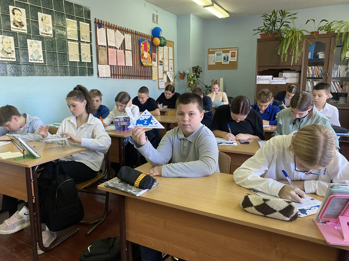 Ученики 8 В класса посмотрели киноурок "Пять дней". Этот фильм затрагивает такое качество как «созидательный труд». Ребята начали обсуждать, где может пригодится их помощь. Ребята решили убрать территорию и выполнить генеральную уборку класса. Затем совместно с классным руководителем написали письма бойцам СВО. Но больше всего восьмиклассникам понравилось плести маскировочные сети для бойцов СВО. Этим они помогали своей Родине.
