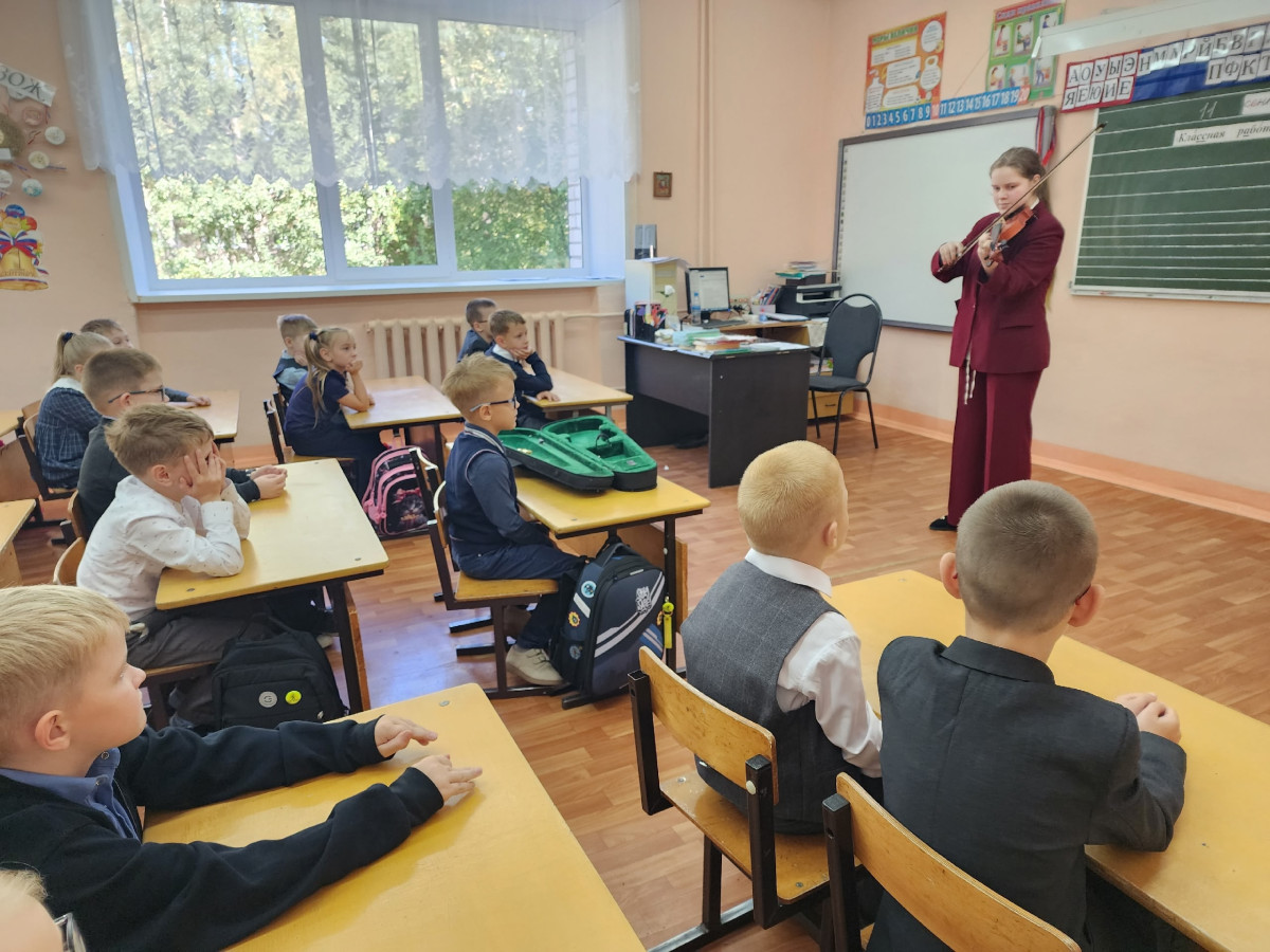 Первоклассники с удовольствием посмотрели фильм "Эра". Это в их жизни был первый просмотр в проекте "Киноуроки". Перед просмотром поговорили о том, что такое мечта, рассказали о чём каждый из них мечтает. После просмотра вывод был сделан однозначный, надо мечтать и стремиться к исполнению мечты, но в разумных пределах. Затем перед первоклассниками выступила наставница, ученица 9 "Б " класса Челпанова Виктория. Она рассказала о том, как мечтала научиться играть на скрипке. Её мечта сбылась. Вика исполнила перед ребятами музыкальную композицию. Первоклассники долго апплодировали. Затем ребята попросили попробовать поиграть на скрипке. Вика позволила ребятам попробовать себя в роли музыкантов. Так первоклассники прикоснулись к мечте. Многие из них заинтересовались. Теперь у многих первоклассников появилась мечта- игра на скрипке. Вперёд, у вас всё получится.