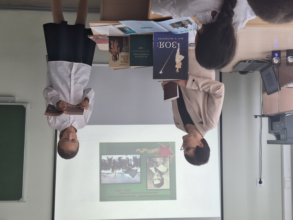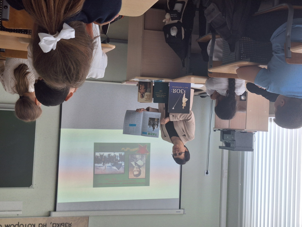 Учащие 5 класса просмотрели фильм "Навсегда", который заставил их задуматься над понятием "отвага". Дети рассказывали о своих дедушках и бубушках, проявивших это качество при защите своей страны. После их сообщений выступила библиотекарь Раева Эля Валентиновна, которая рассказала о подвиге Зои Космодемьянской. Ребят до слёз затронула история Зои. Подготовленные ученики читали стихи о Зое.