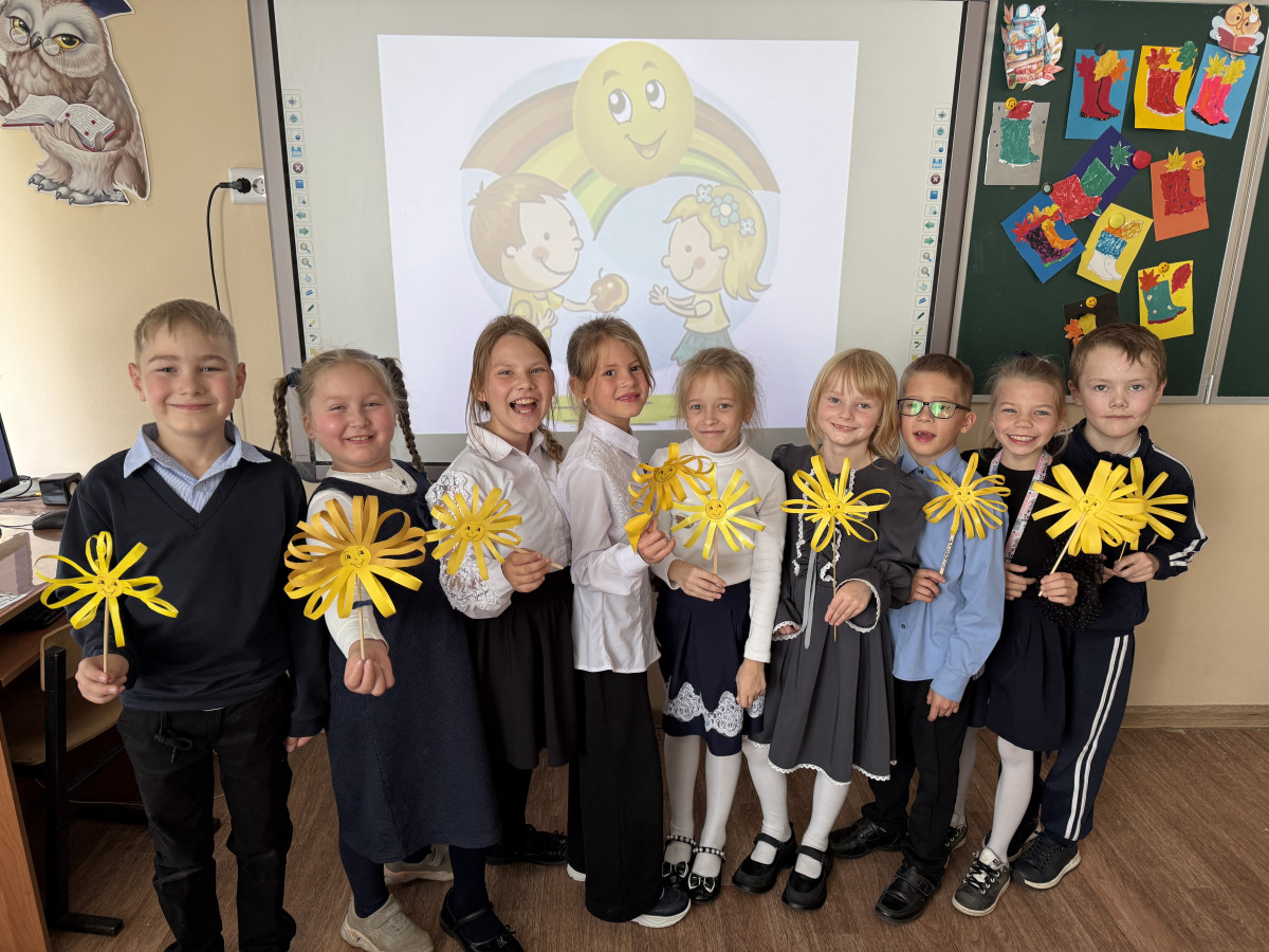 Ученики 2 "В" класса МБОУ СОШ №2 ЗАТО Озерный посмотрели и обсудили короткометражный фильм "Хорошие песни", посвященный такому качеству личности , как доброжелательность. После просмотра обсудили поведение главных героев. Сделали вывод, что добрые дела дарят радость не только себе , но и окружающим. Ребята сделали вывод , что изменить сложную ситуацию можно при помощи простых поступков:подарить улыбку прохожему; исполнить песню , где можно проявить дружелюбие, сочувствие ; поддержке друг друга. Ученики 2В класса решили подарить хорошее настроение окружающим с помощью своих поделок и улыбок. Для этого они изготовили солнышки с пожеланиями и подарили прохожим.