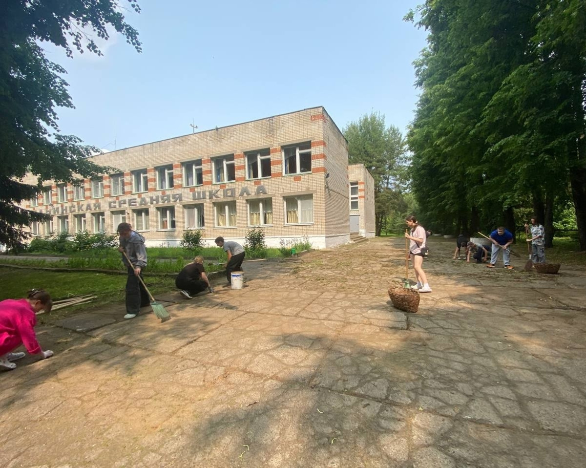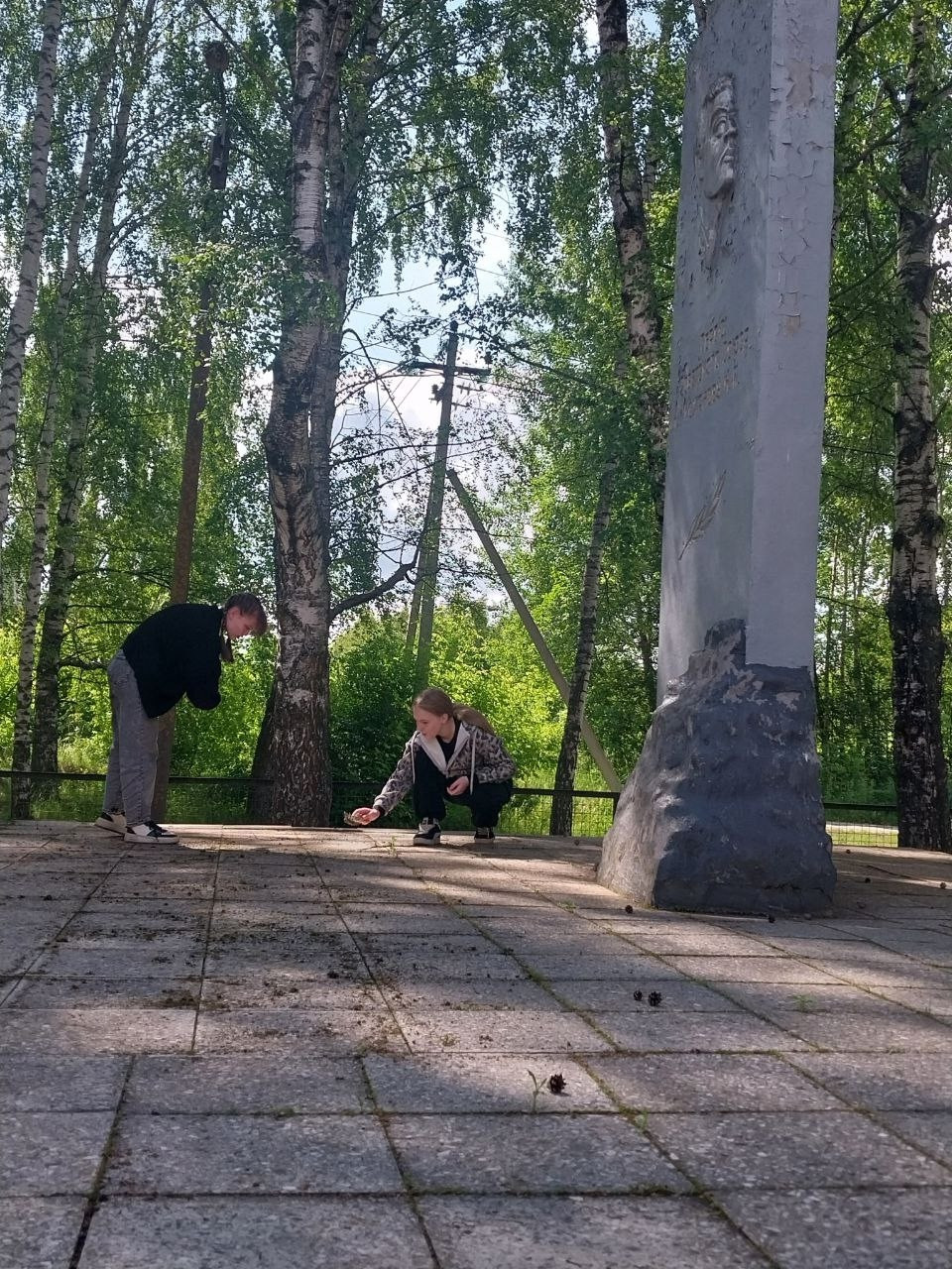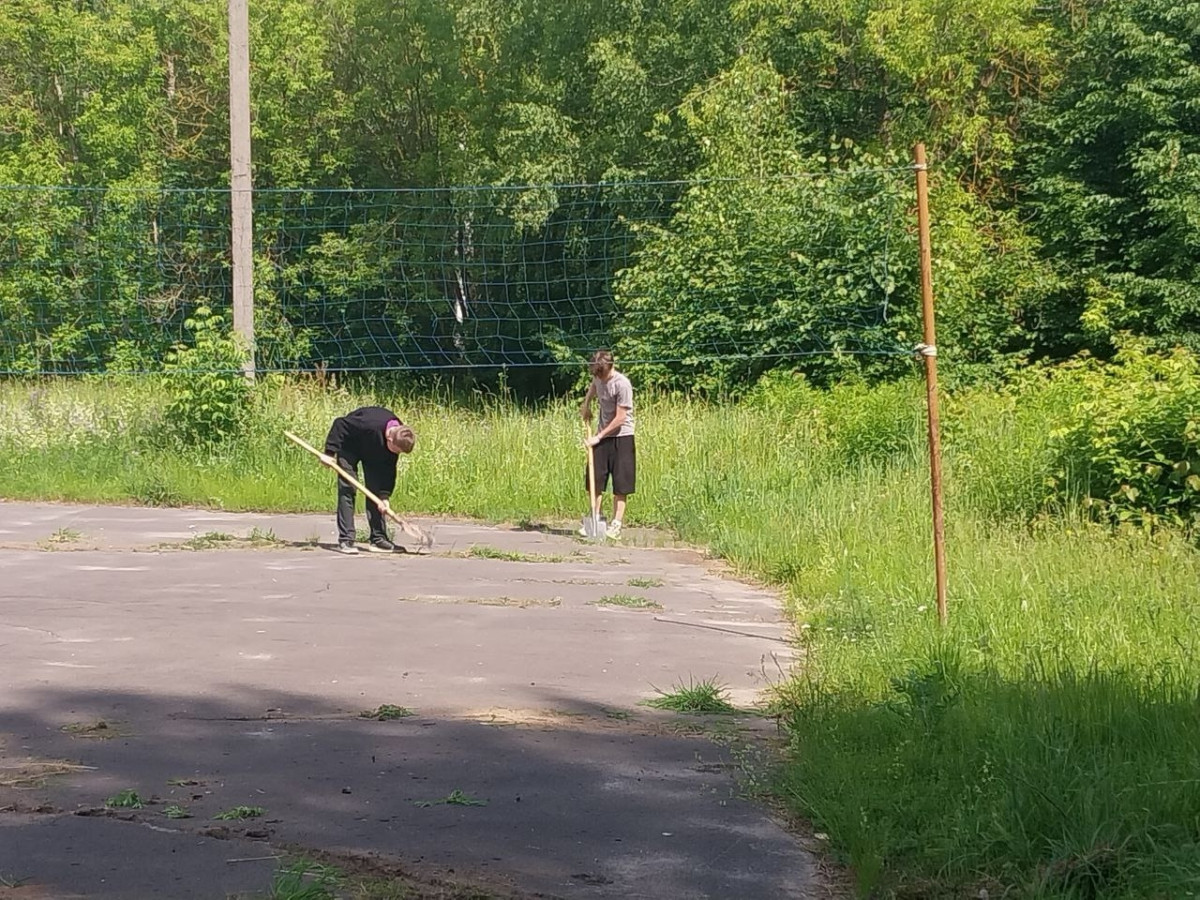 В этот раз они предложили расчистить спортивную и игровую площадку от мусора и поросли. После долгого лета привели в порядок пришкольную территорию. Девочки привели в порядок памятник герою Н.П. Кожанову.