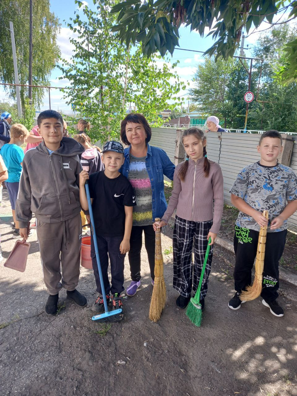 Дети принесли веники, перчатки, пакеты для мусора....