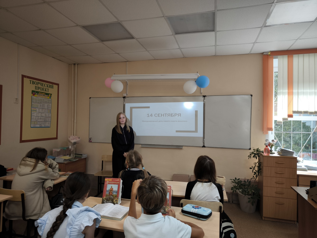 Накануне Международного дня памяти жертв фашизма обучающиеся 6 б класса посмотрели фильм "Торопись жить". Просмотрев фильм, ребята сделали вывод, что главный долг живых - помнить ушедших. Обязанность будущего поколения помнить о страшных датах истории, хранить память о тех, кто погиб от рук захватчиков, от голода, в концлагерях. На практику к нам пришли активисты 10б и рассказали ребятам из 6 класс о Международном дне памяти жерт фашизма.