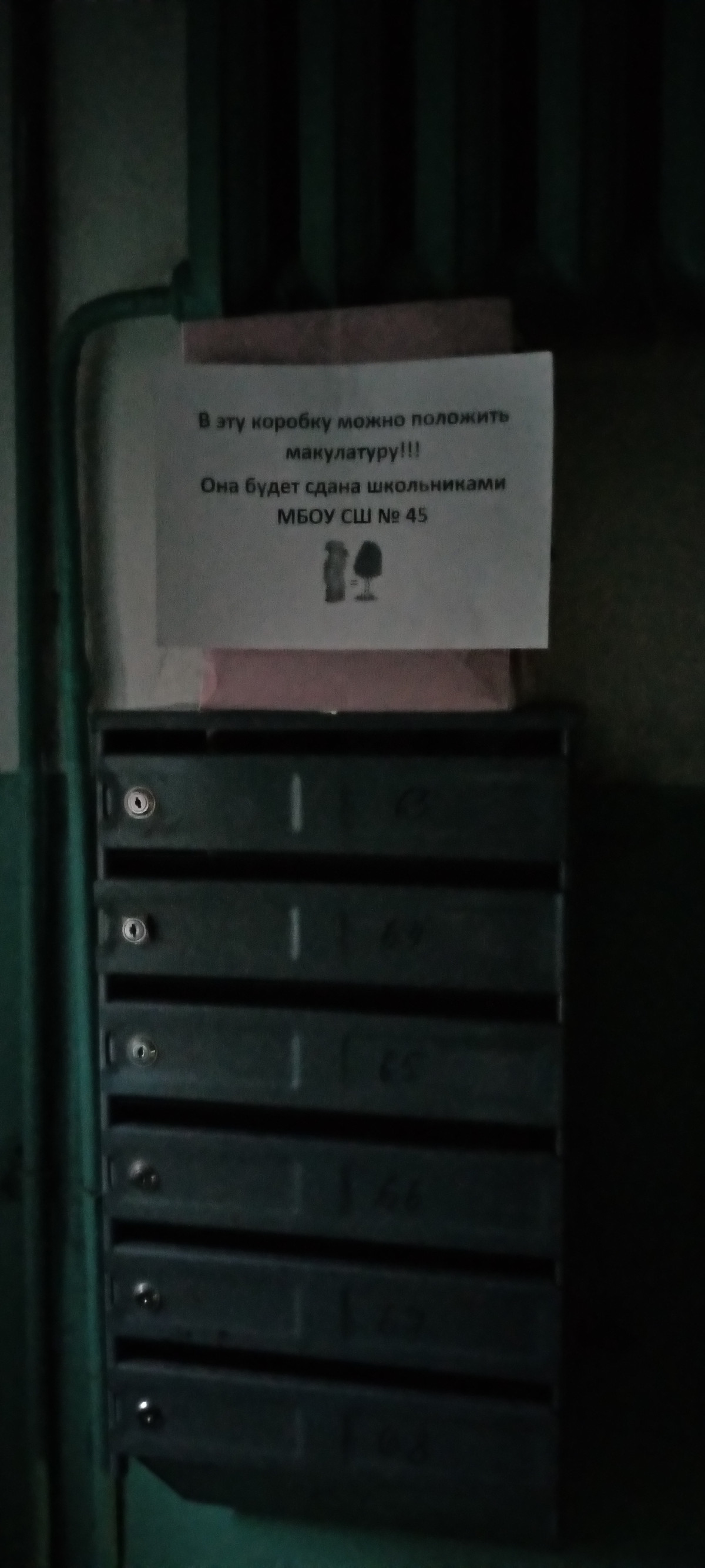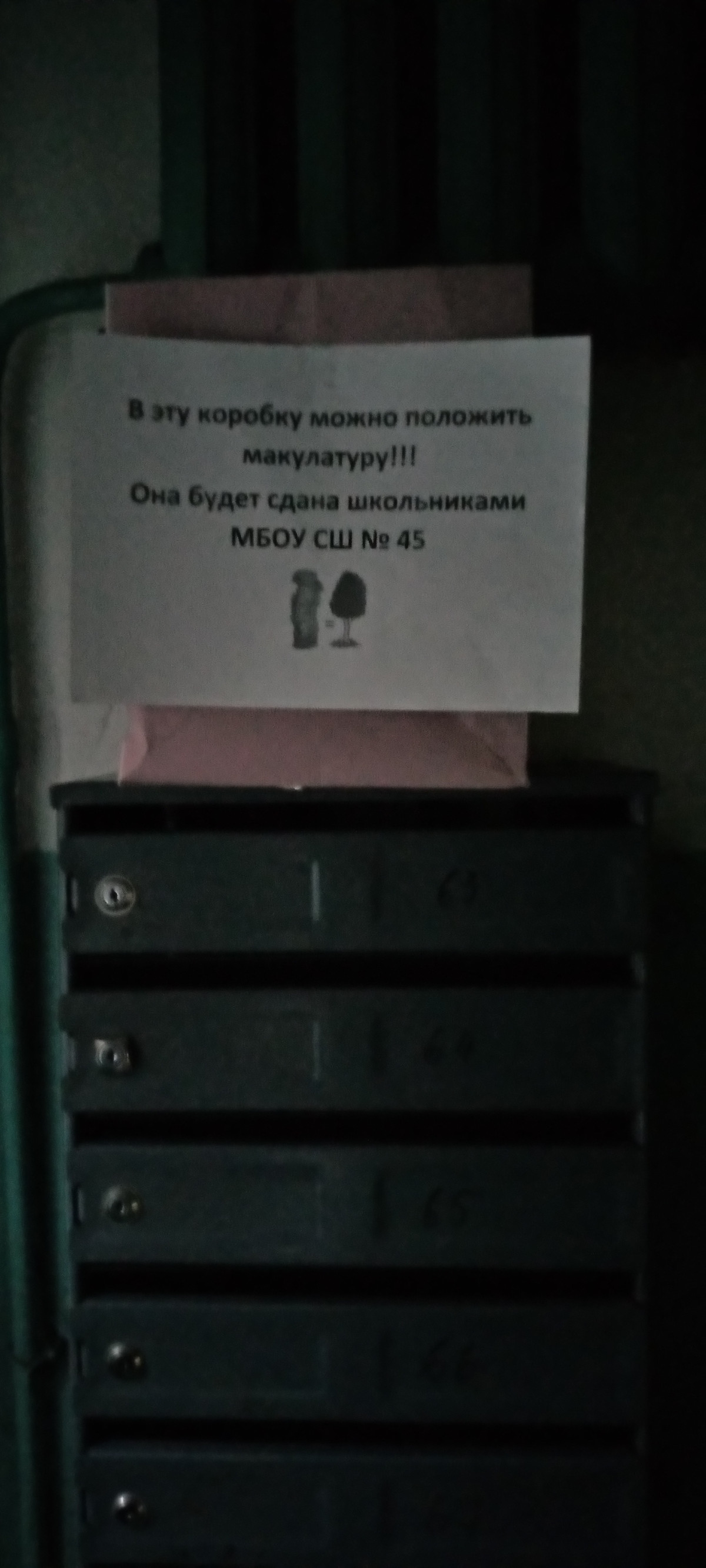 После просмотра фильма состоялось обсуждение. В сентябре в школе ежегодно проводится сбор макулатуры. Ребята предложили не только принести свою макулатуру, но и задействовать своих соседей. Они прошли по квартирам своих домов, а также разместили рядом с почтовыми ящиками коробки с надписями «Сюда можно положить макулатуру. Она будет сдана школьниками МБОУ СШ № 45». В результате макулатуры учащимися было собрано в среднем в три раза больше обычного.