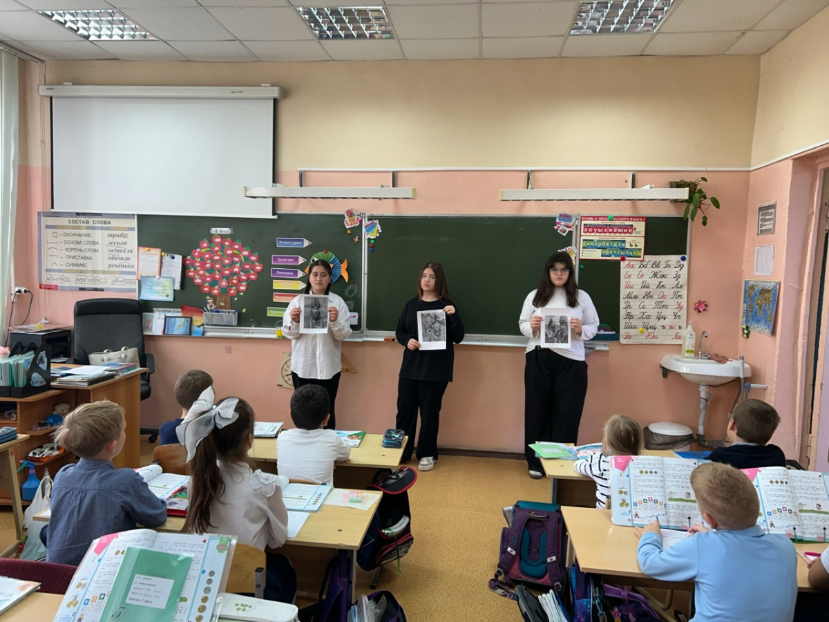 3. Учащиеся 8 б сходили к 1 б классу и рассказали о военных коресспондентах, о том как им бывает нелегко, но они все равно выполняют свою задачу.