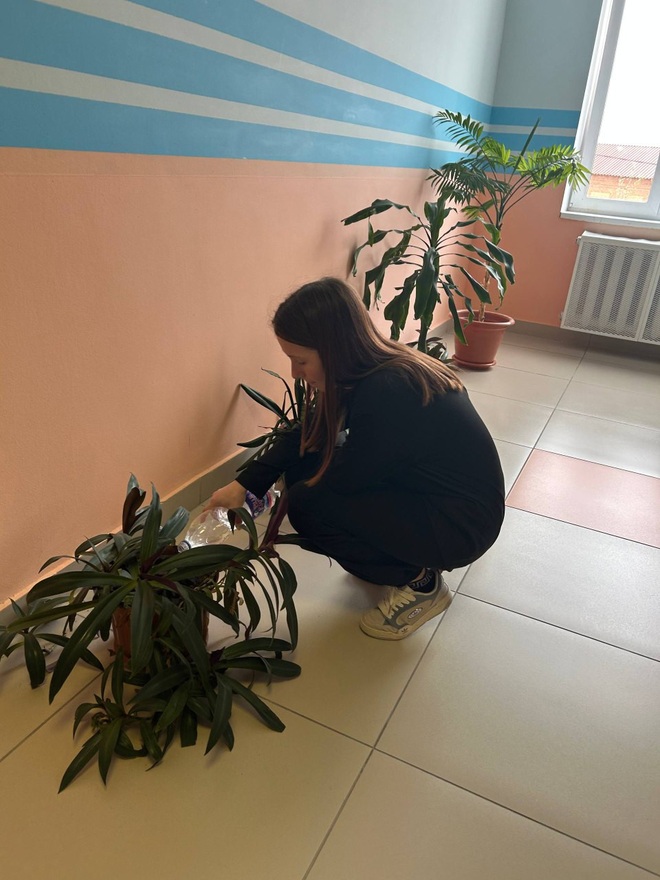 После просмотра фильма, ребята решили, что социальная практика будет проходить весь год. Каждую неделю девочки будут поливать цветы у учительской и во всех коридорах школы. Сегодня четверг- мы приступили к выполнению нашей обязанности.