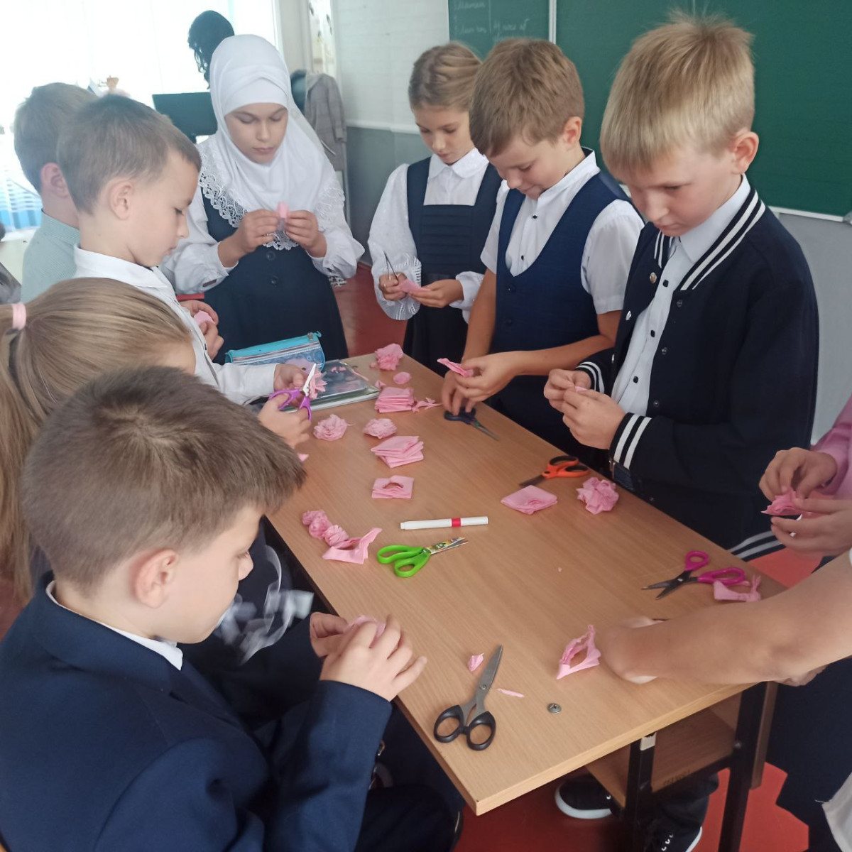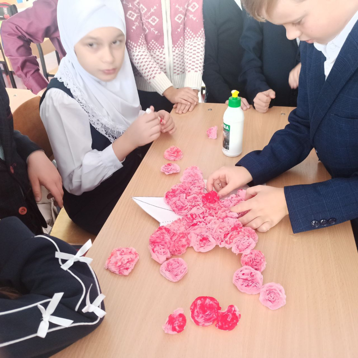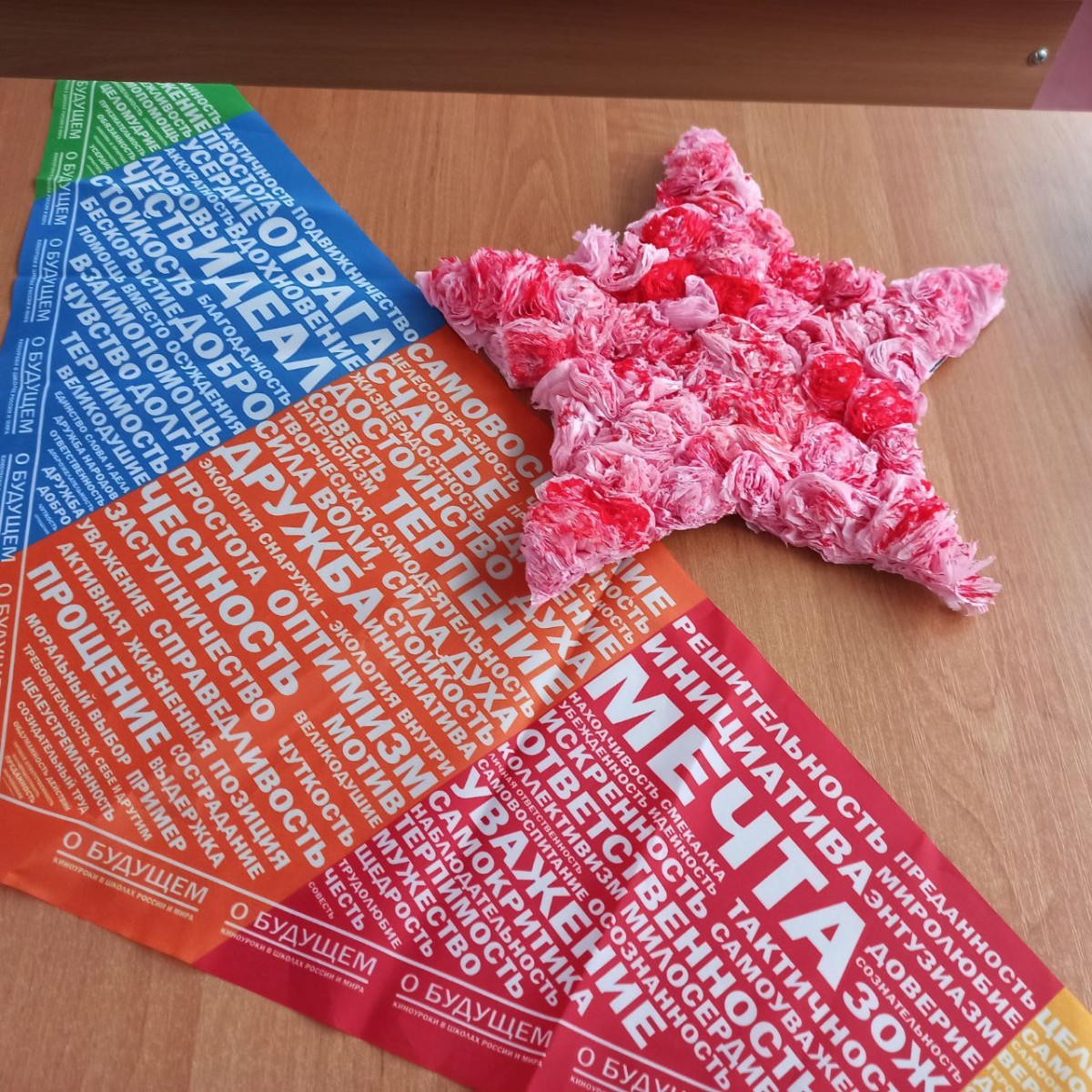 В знак дружелюбия, решили отправить записанное нами видео Юлии Сергеевне, а по предложению девочек класса, принято решение сделать памятный подарок – коллективную поделку «Звезду знаменитого земляка» (родители закупили салфетки, вырезали шаблон звезды, а ребята, с удовольствием мастерили гвоздики, наклеивали их на пятиконечную звезду).