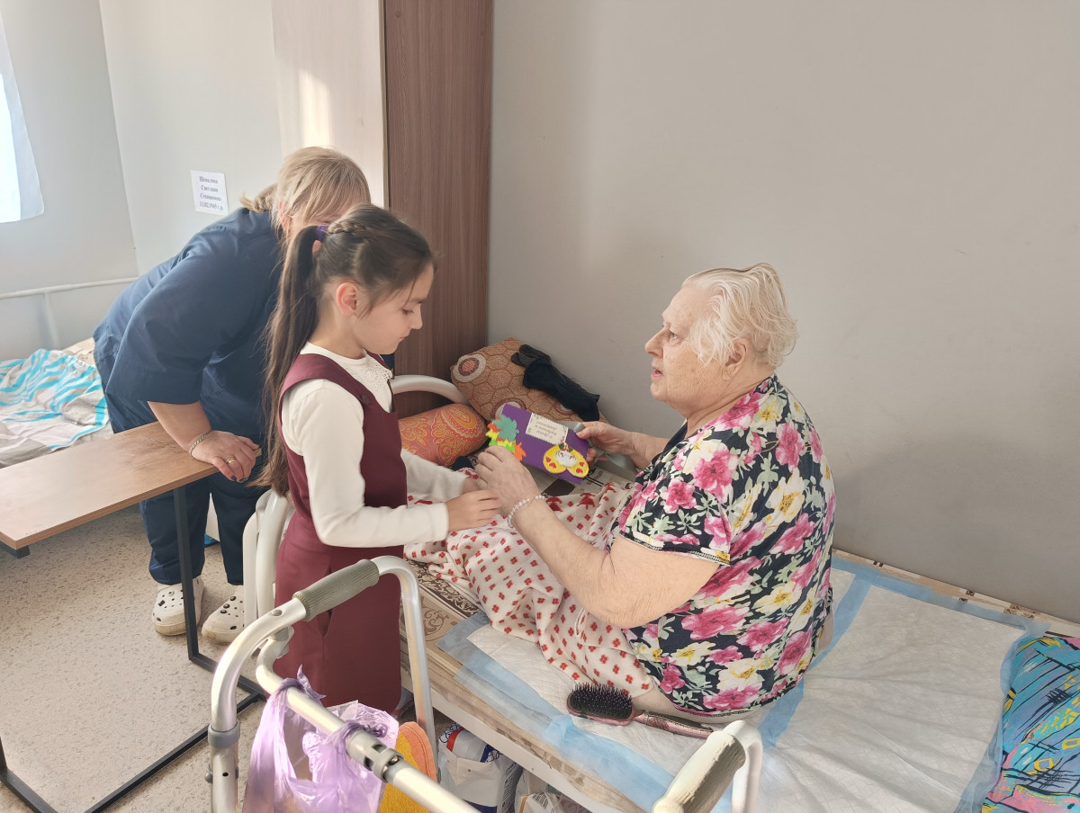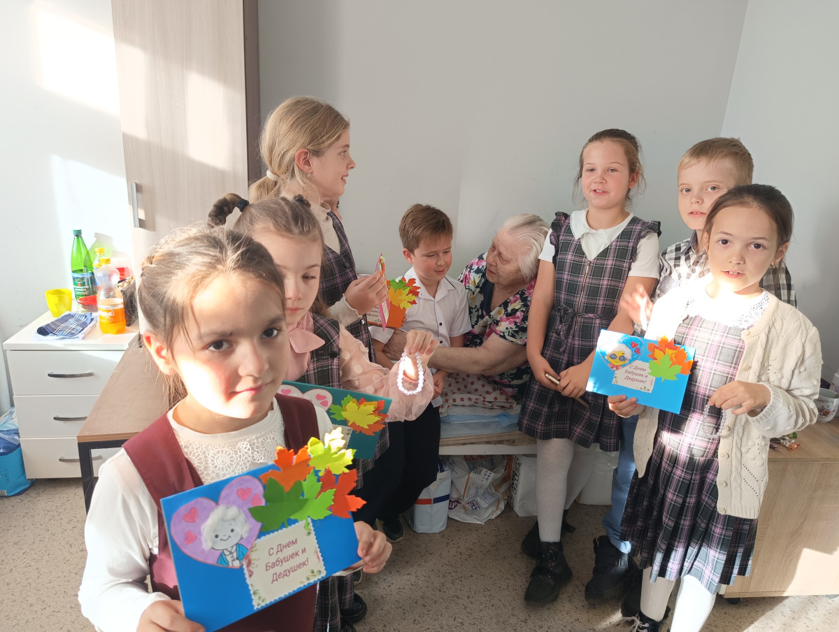 Ребятам очень понравился фильм и каждый хотел рассказать о своей семье, про своих дедушек и бабушек. Мы постарались выслушать всех. Оказалось, что внимание нужно не только родным бабушкам и дедушкам, а еще и другим. Тем, кто по какой-то причине остался без родных. Мы с ребятами решили в день пожилого человека уделить внимание пожилым, которые находятся в доме престарелых.. Наши ученики вместе с классным руководителем принялись за творчество. Классный руководитель 2 Г класса Бесхлебная О.Ю.и учитель доп.образования Финникова Н. О. провели мастер - классы по изготовлению браслетов из бусинок и открыток ко дню пожилого человека. В каждой работе чувствовалась искренняя любовь и уважение. Идея проста и прекрасна:своими руками сделать красивые браслеты, чтобы подарить их тем, кто особенно нуждается во внимании и заботе. В день праздника "День пожилого человека" мы поздравили бабушек из дома престарелых:открыткой и браслетом. Звонкие детские голоса, с трепетом и волнением читали стихи посвященные бабушкам. В каждом слове звучала благодарность и уважение.