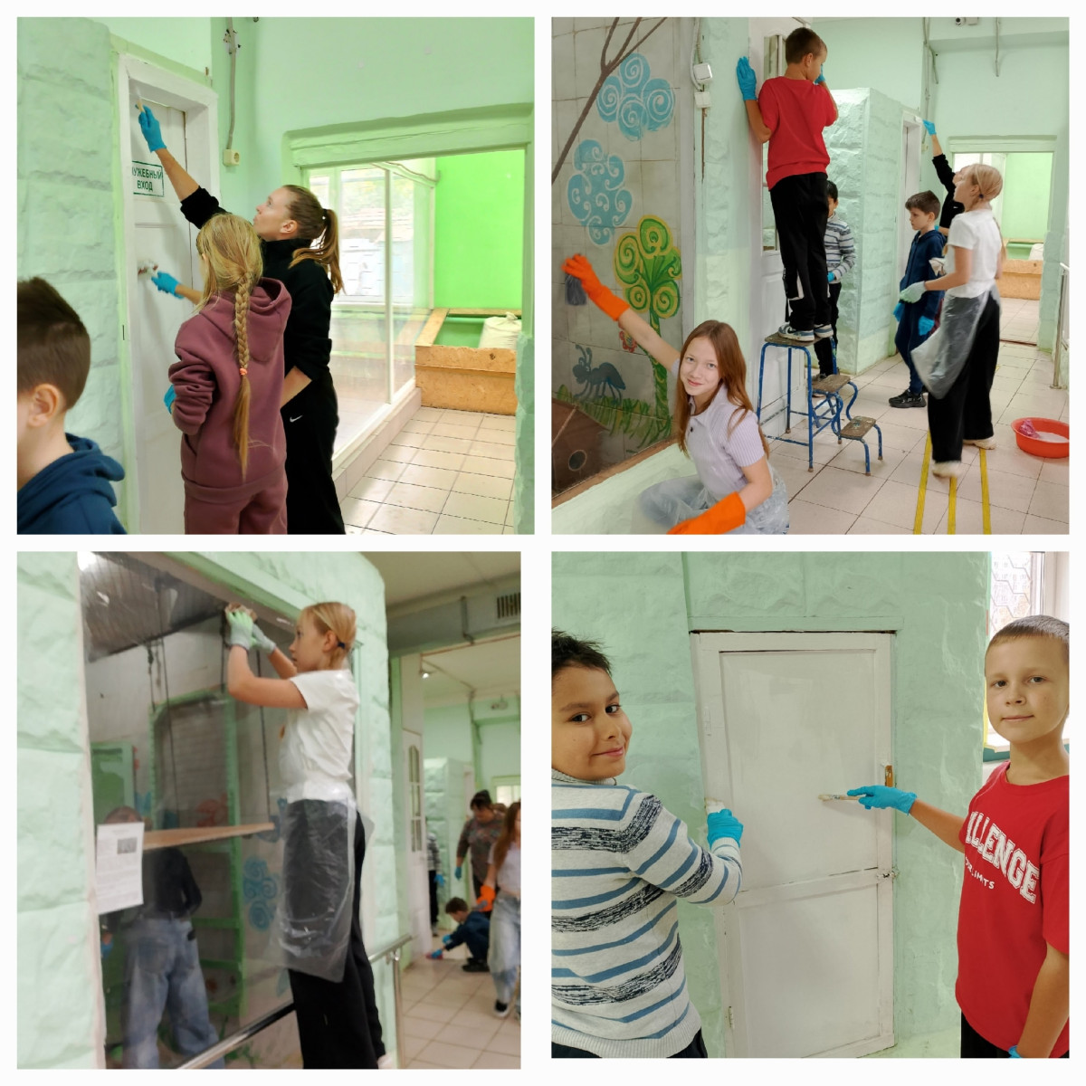 В зоопарке ребята с родителями занимались покраской дверей в клетках и мытьем окон в вольерах. Олеся Афанасьевна попросила девочек вымыть кружки, что оказалось приятным сюрпризом. В благодарность за дружную работу она угостила всех чаем с печеньем.
