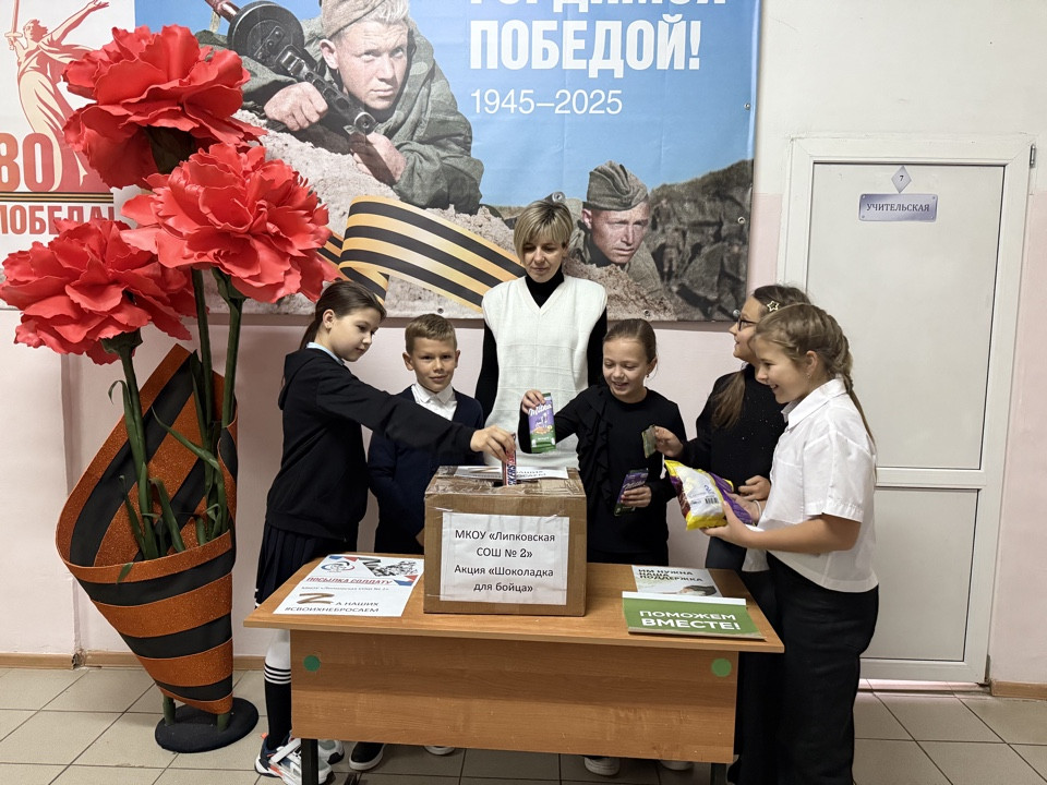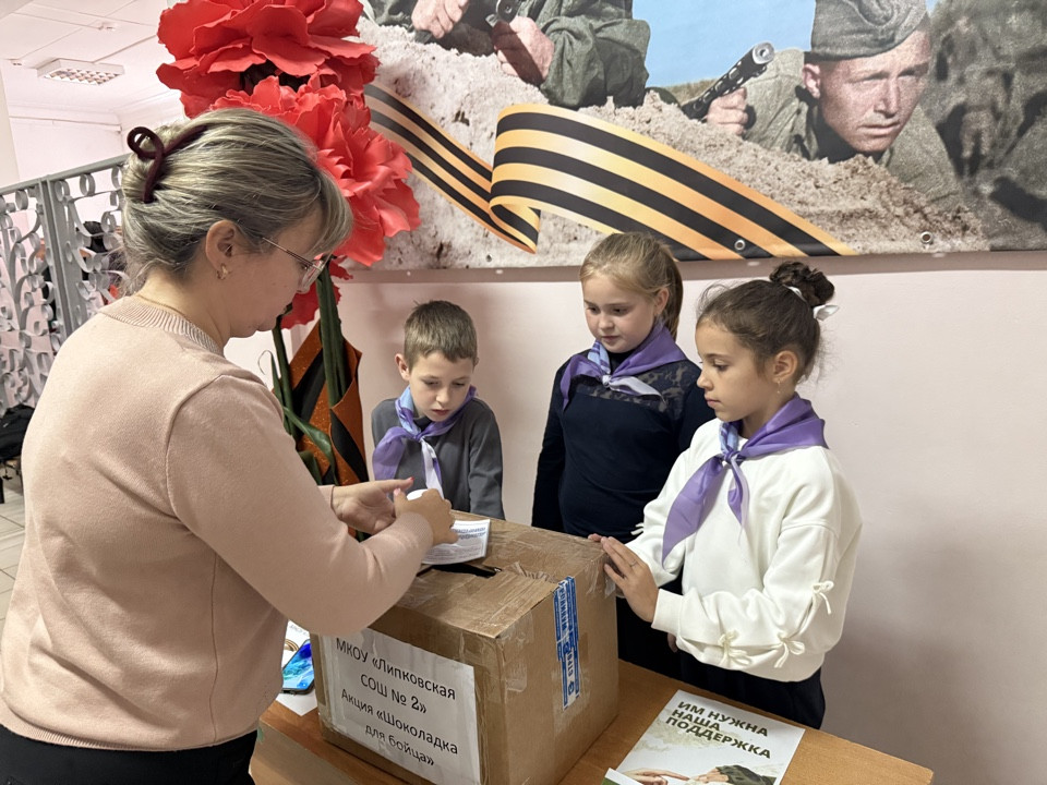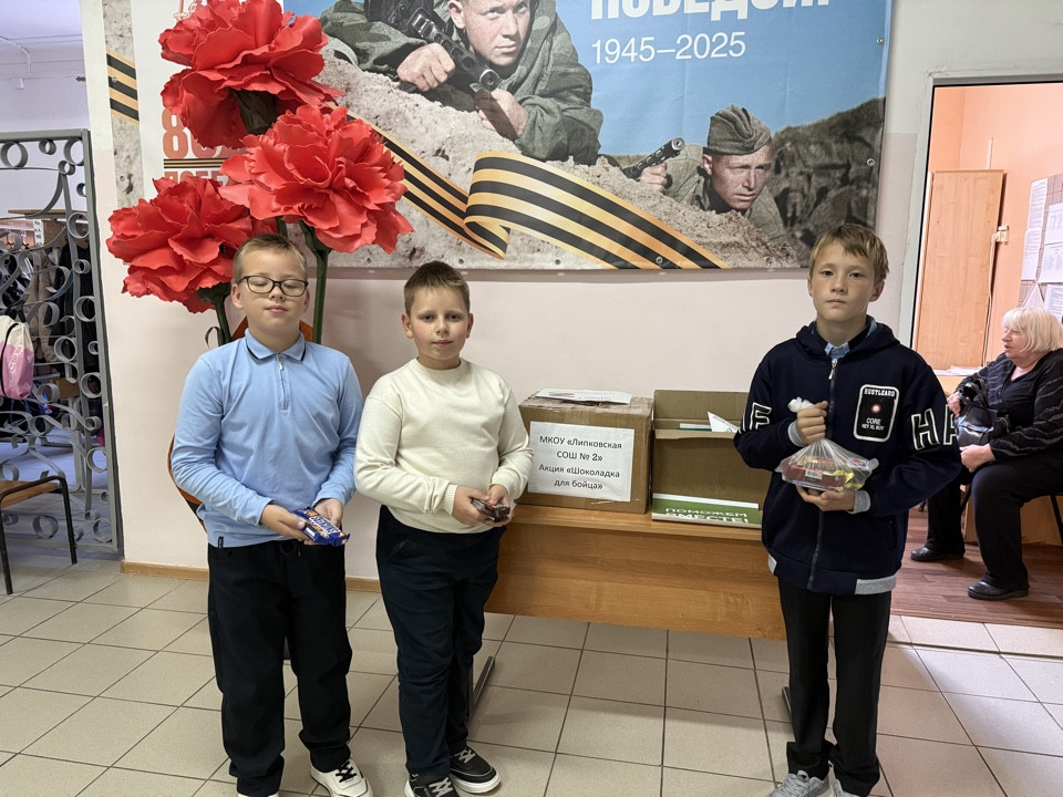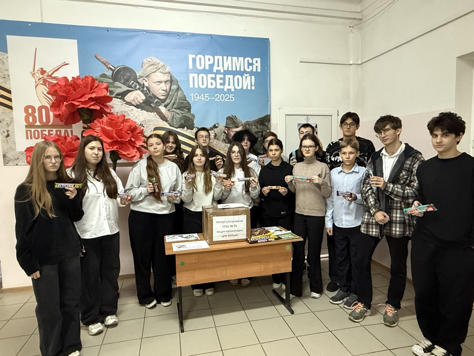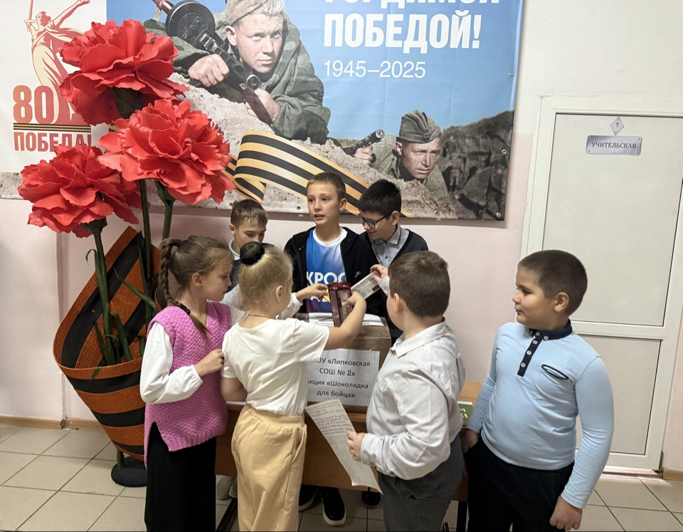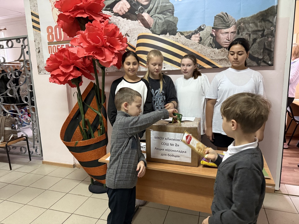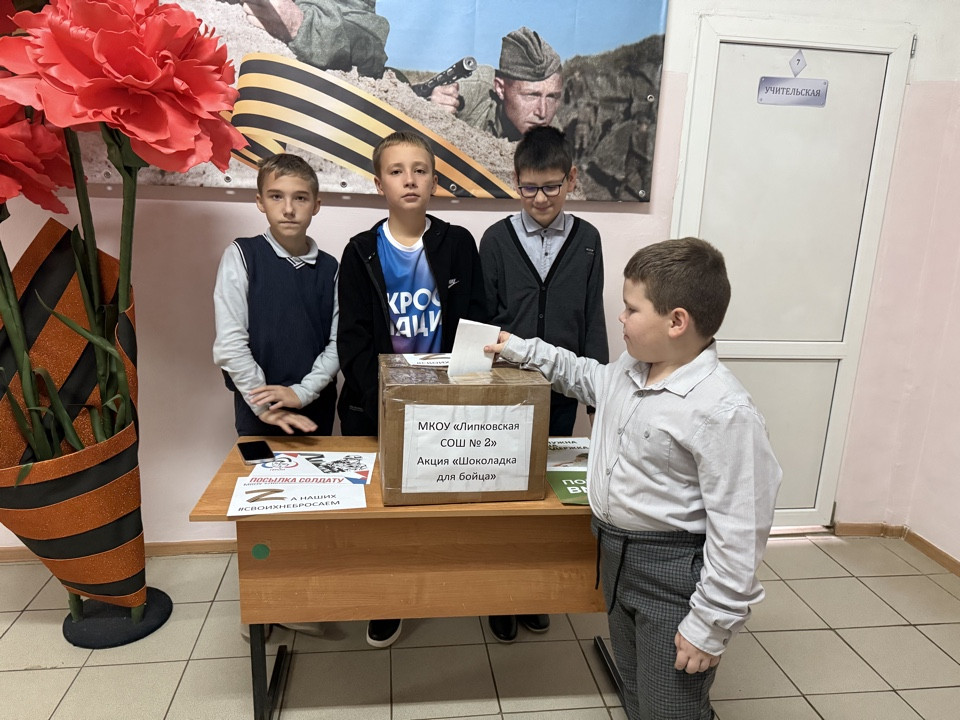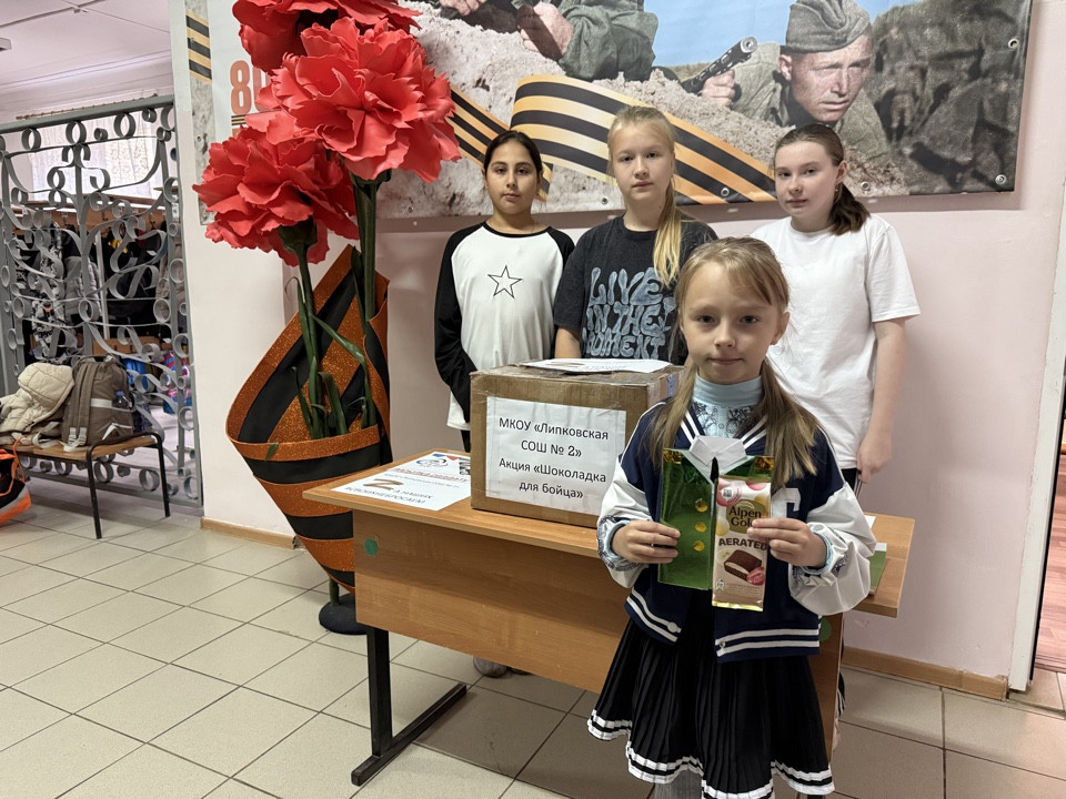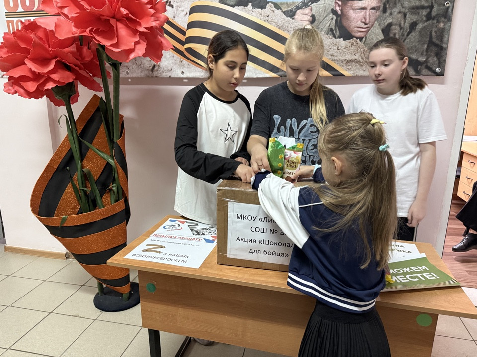 Подготовка к встрече шла полным ходом. Дети решили организовать акцию «Шоколадка для бойца». Ребята напечатали объявления, прошлись по всей школе, рассказали об акции в каждом классе. Когда ребята заходили в класс, они рассказывали, как важно поддерживать солдат на СВО. Учащиеся подготовили коробки, наклеили на них листовки акции и организовали пункт приема.