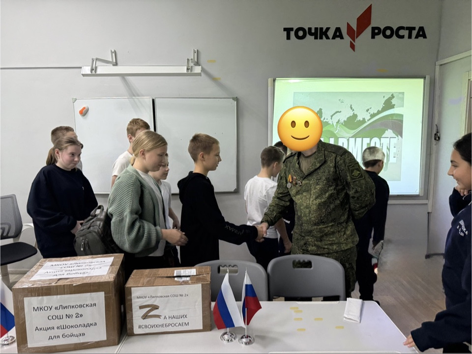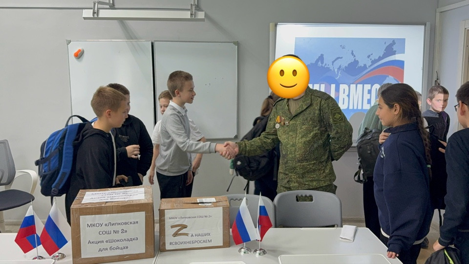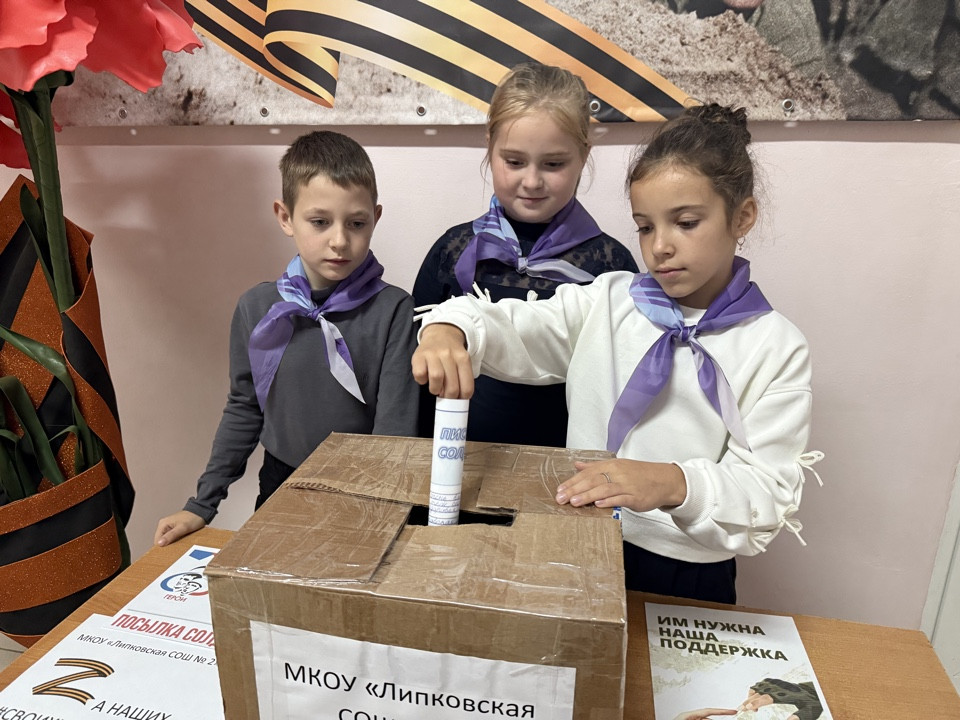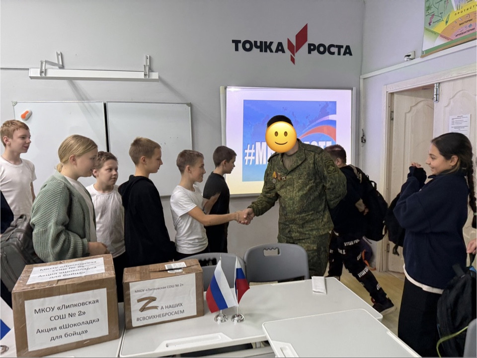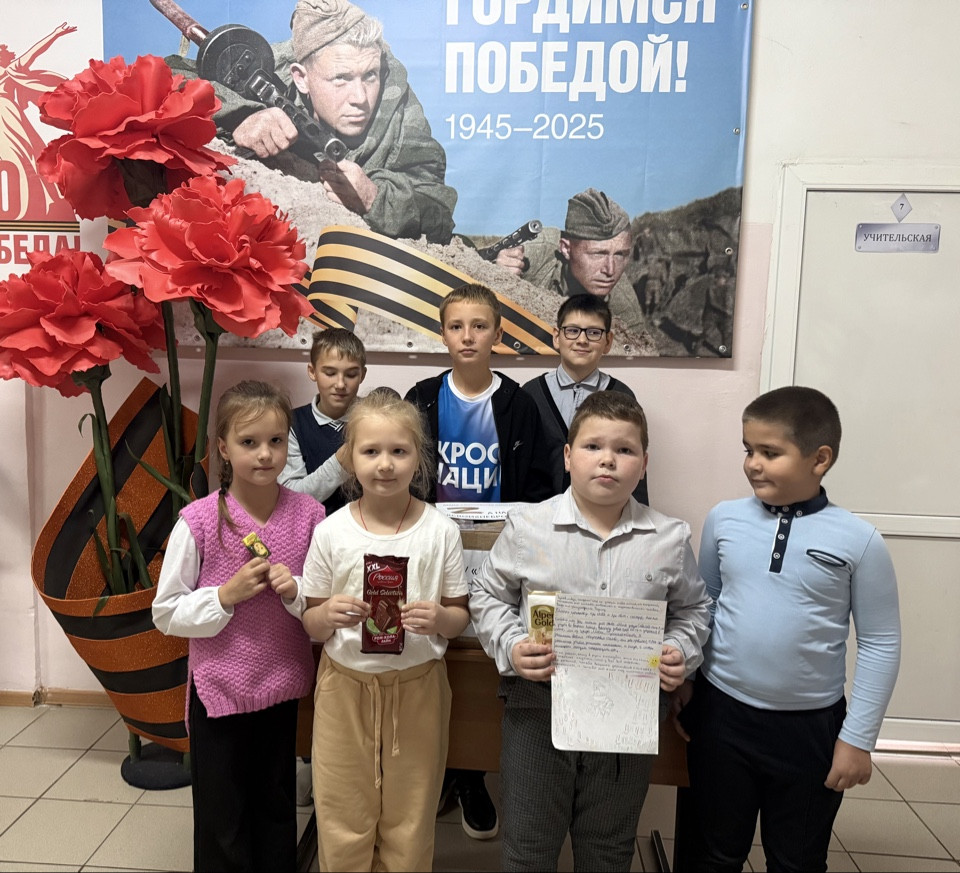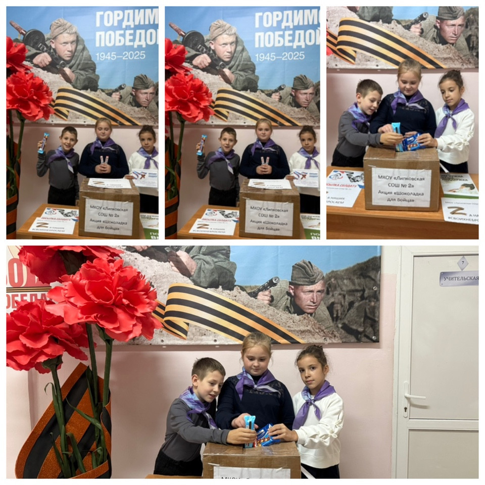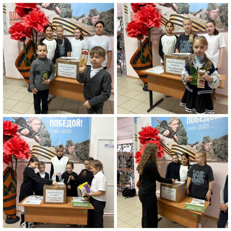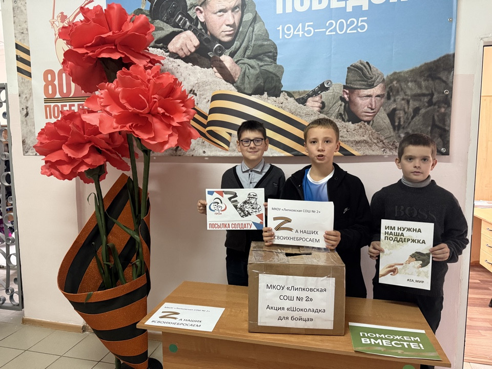 Подготовка к встрече шла полным ходом. Дети решили организовать акцию «Шоколадка для бойца». Ребята напечатали объявления, прошлись по всей школе, рассказали об акции в каждом классе. Когда ребята заходили в класс, они рассказывали, как важно поддерживать солдат на СВО. Учащиеся подготовили коробки, наклеили на них листовки акции и организовали пункт приема.