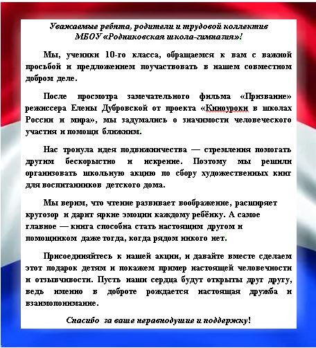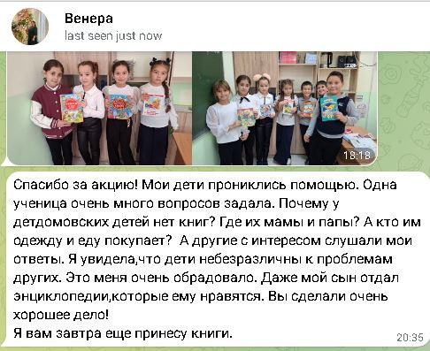 После обсуждения фильма подростки решили инициировать доброе дело, предложенное одноклассницей: собрать книги для воспитанников детских домов. Тут же последовало предложение организовать сбор книжек по школе. Записали обращение, разместили его в пабликах школы и #Киноуроки_РеспубликаКрым в ВК https://vk.com/wall311430305_1843