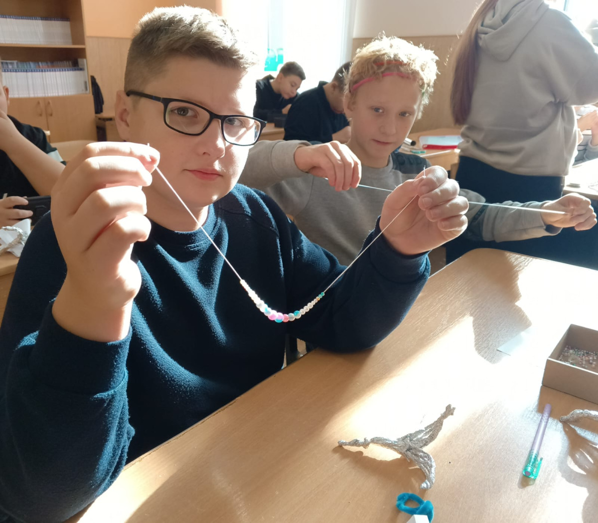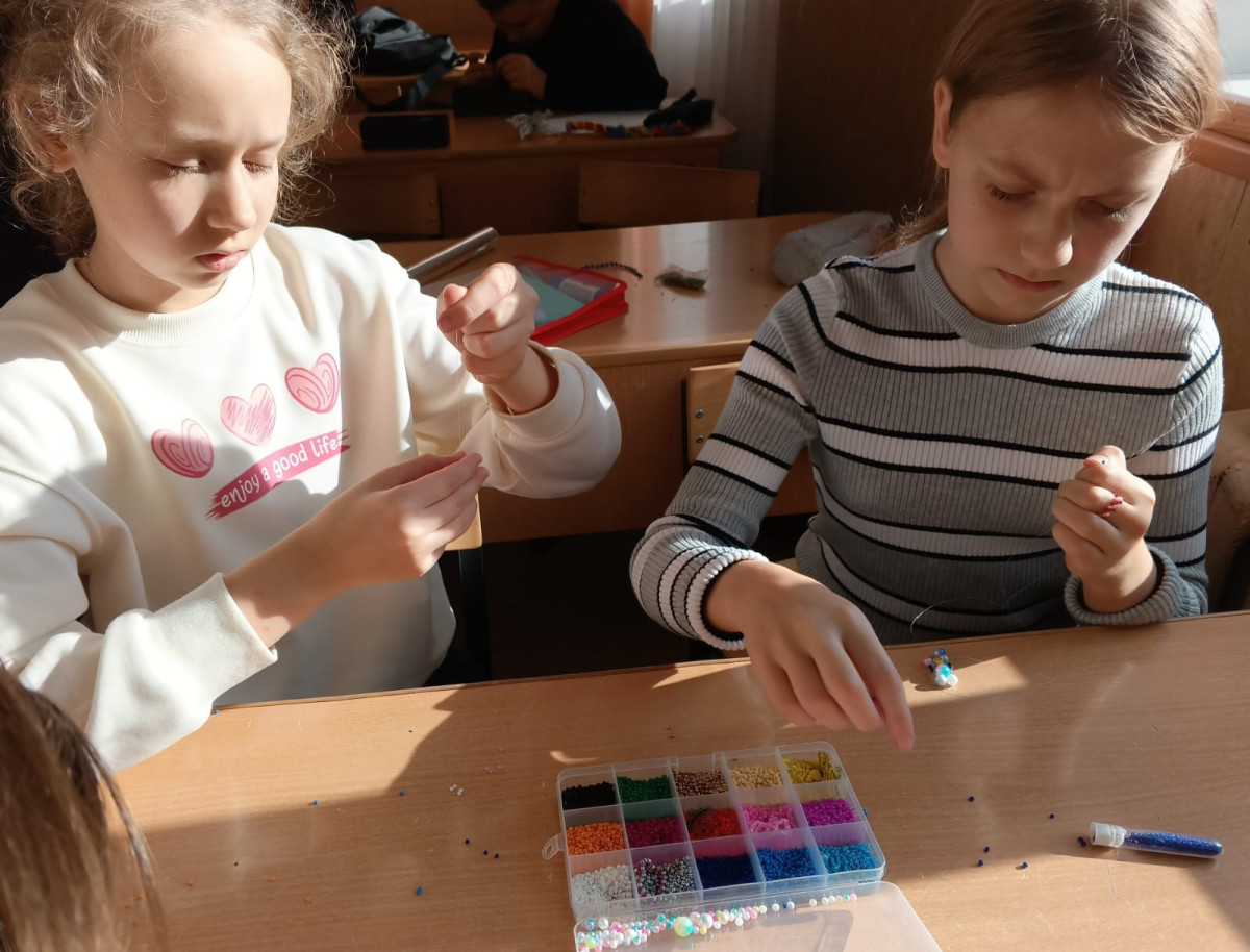 Для участия в акции ученики, совместно с родителями приобрели разноцветные бусинки, бисер и мы приступили к работе.