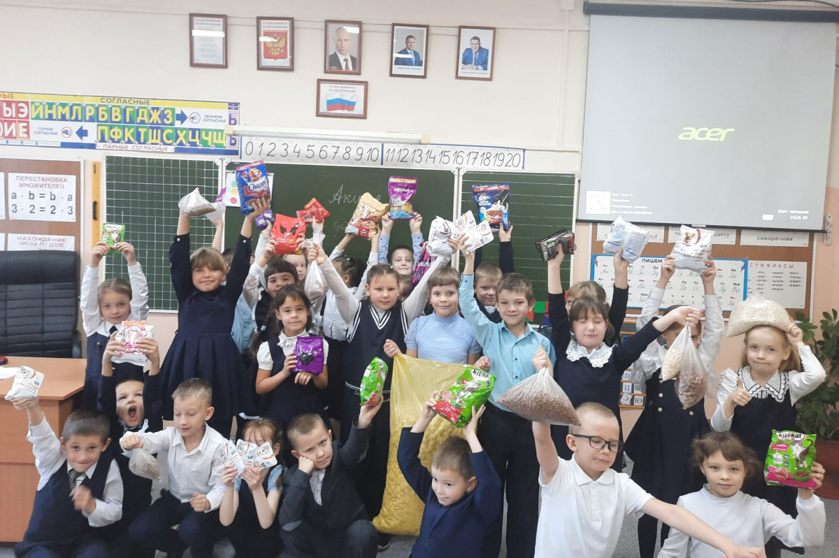 Ребята предложили классному руководителю идею поучаствовать в общегородской акции «Лапа добра», Родители с радостью поддержали ребят и приобрели корм для животных, игрушки, витамины. Каждый первоклассник принял участие в акции. Все собранные предметы были упакованы и переданы волонтерскому отряду школы. А волонтеры унесли собранные посылки в приют для животных.