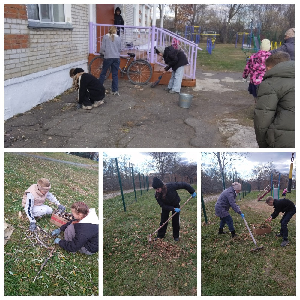 Одна из мам предложила начать с помощи в уборке территории в детском саду. Эту идею поддержали. В назначенный день пришли не только дети 5 класса, но и подключились некоторые школьники 1, 6, 8 классов, а так же родители. Мы почистили дорожку от отколовшихся камней, убрали на территории листву, собрали палки.
