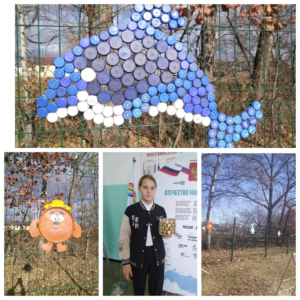 Учащиеся 8, 9 классов сделали из крышечек подставку для карандашей, и украшения в виде различных персонажей, которыми украсили забор детского сада.