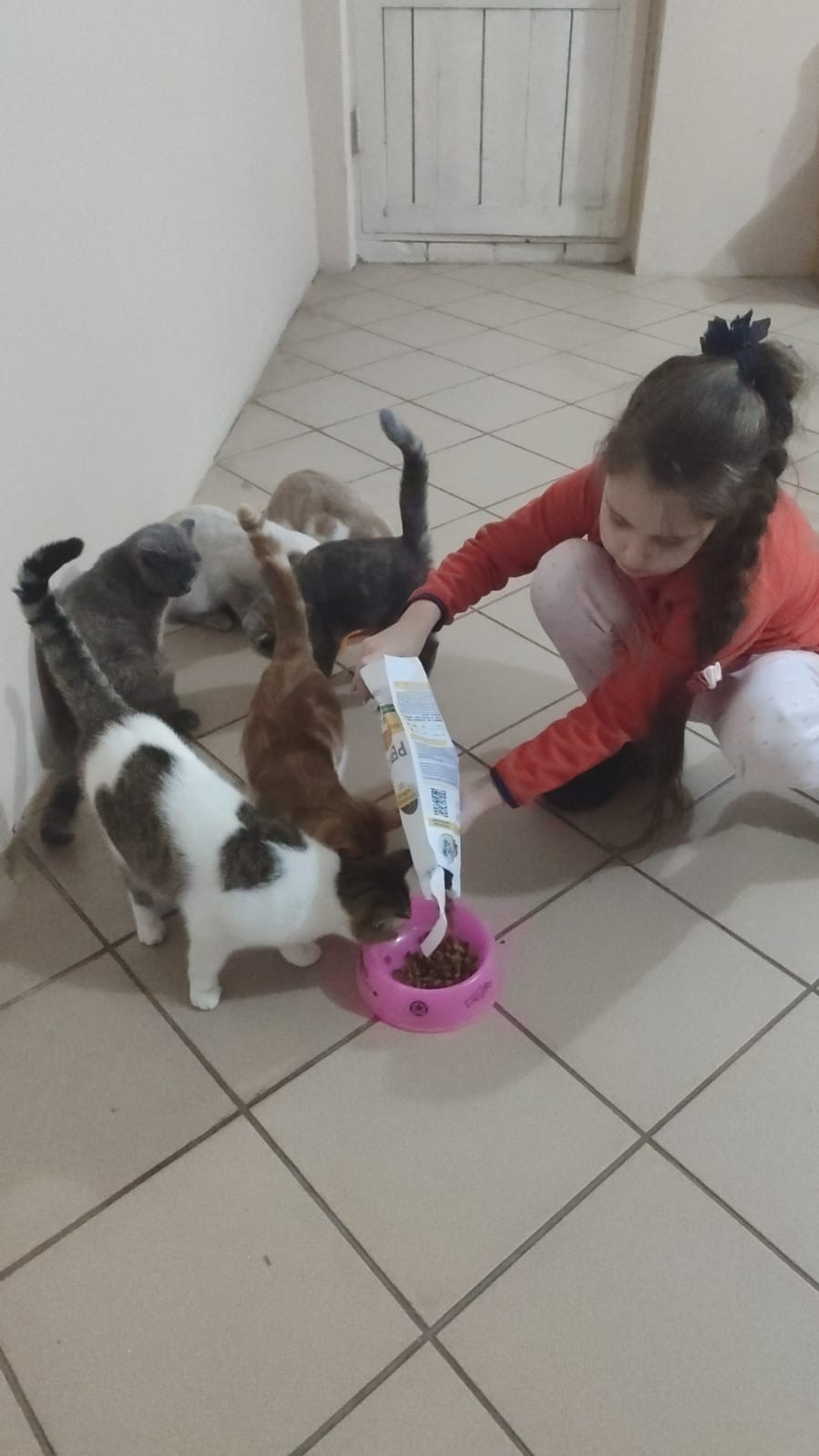 Еще одним делом было организация помощи животным, которые пришли на школьную территорию. Ребята по своим возможностям приносят корм, определили им место для принятия пищи. Под присмотром взрослых, ученики кормят животных (котов и птиц). Скоро зима и помощь ребят просто необходима животным.