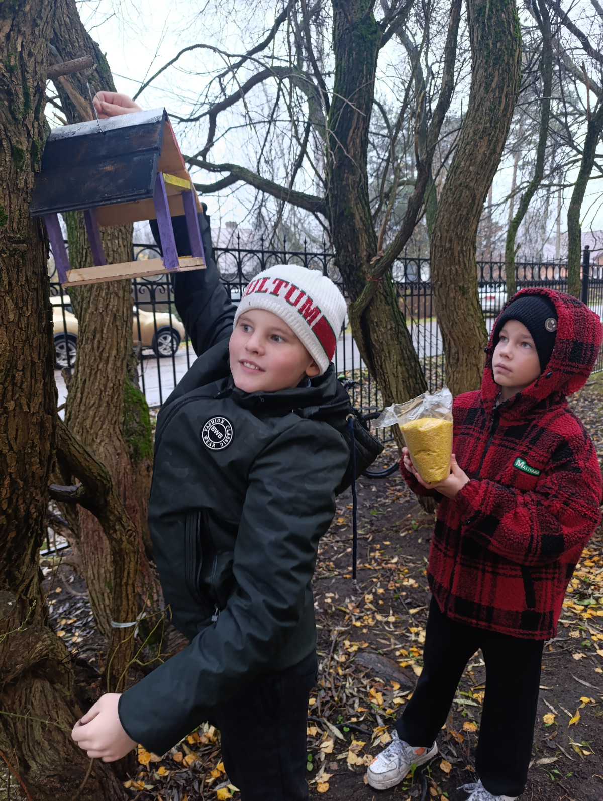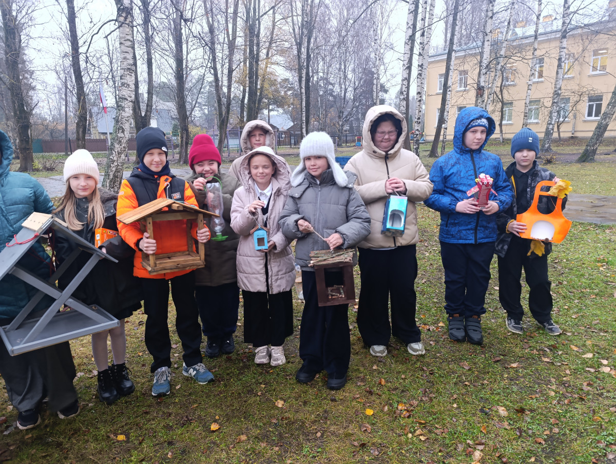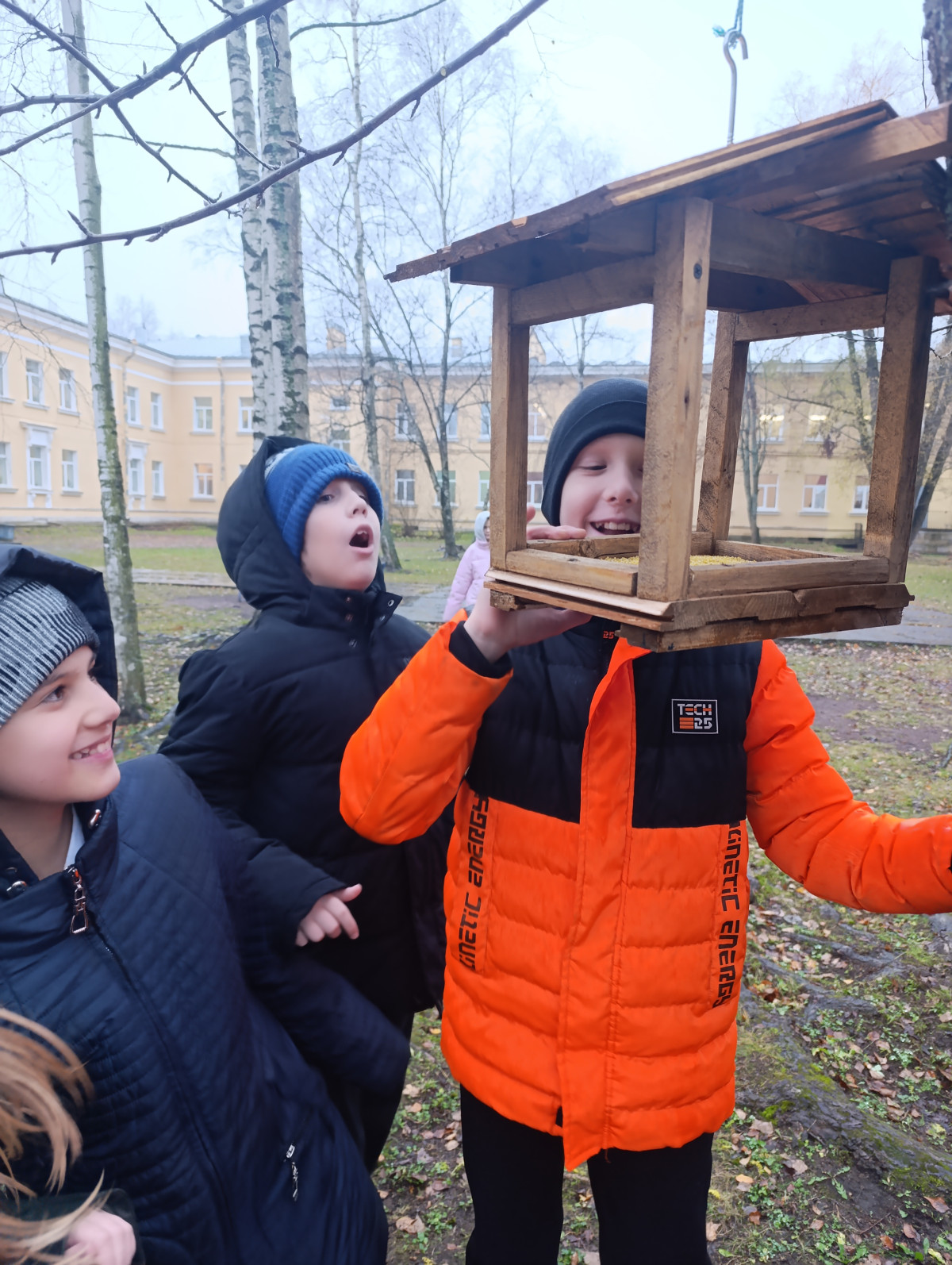 5. После каникул в школе прошла презентация кормушек. Четвероклассники обсудили трудности, с которыми столкнулись при изготовлении кормушек. Затем был разработан график дежурств по наполнению кормушек и выбраны места для их размещения — на пришкольной территории и в поселке рядом со школой. Когда кормушки повесили, а корм положили, ребята поделились впечатлениями.