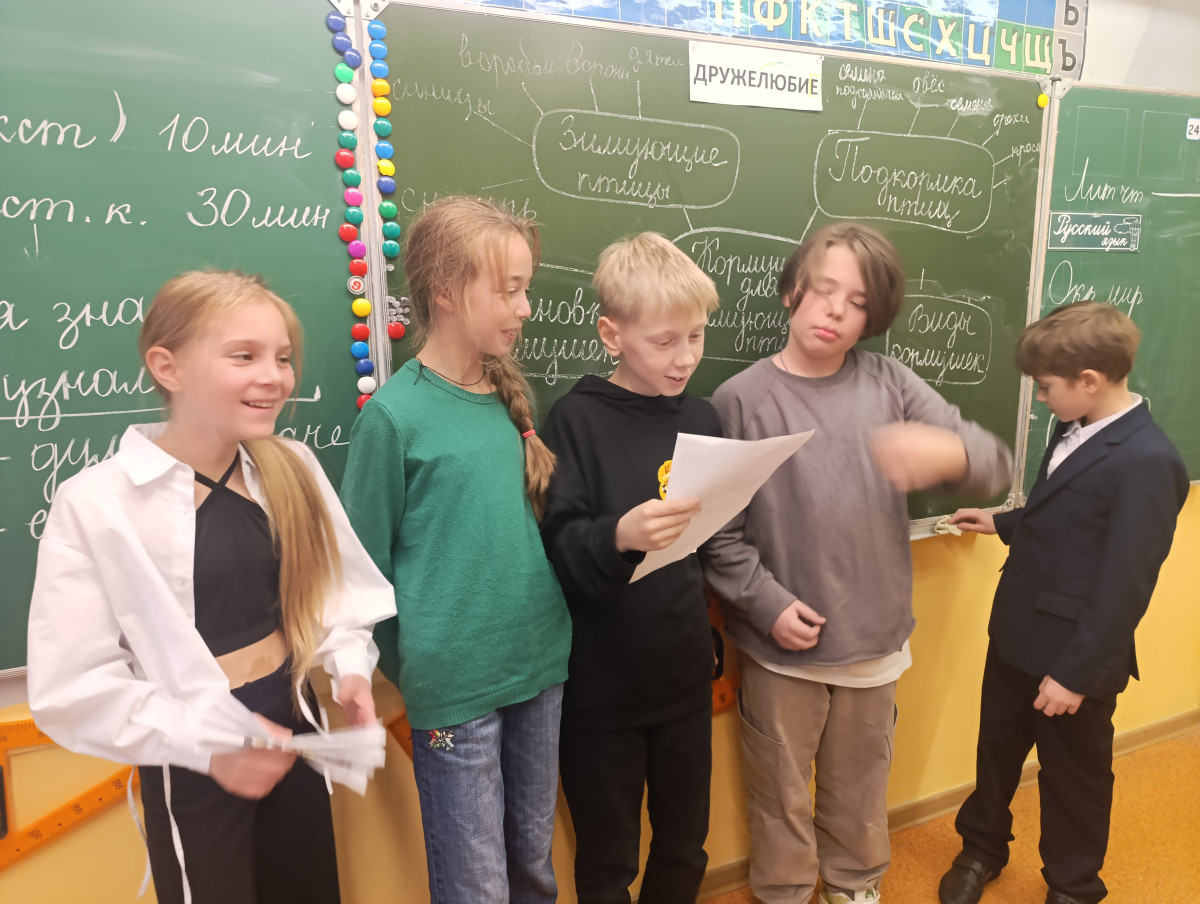 Перед просмотром фильма ребятам было предложено подумать над значением слова «дружелюбие». Ребята разобрали слово по составу, подобрали однокоренные слова и попытались сформулировать, что такое дружелюбие. После этого обучающиеся 4 Б класса посмотрели фильм «Песня ветра», который помог им осознать суть такого духовно-нравственного качества как дружелюбие. В фильме рассказывается про мальчика Ахмета, который предпочёл спасти бабочку, а не угодить девочке, попросившей приколоть насекомое к рамке. Через этот поступок героя ребята осознали, что качество дружелюбие проявляется не только к людям, но и ко всему живому, а истинная дружба строится на уважении к жизни и принципам. Обучающиеся очень сильно сопереживали главному герою: «Он один против всех, но поступил по совести», осознали связи человека и природы: «Бабочка — тоже кто‑то, у неё есть жизнь». В ходе обсуждения дети смогли сформулировать своё определение дружелюбия: «Это когда ты не обижаешь никого: ни человека, ни животное, ни растение. И помогаешь, если можешь». Вдохновлённые фильмом, ученики предложили: «Давайте покажем дружелюбие на деле — поможем птицам зимой!». Социальную практику ребята начали с обсуждения: «Как мы можем проявить дружелюбие к птицам?». Четвероклассники предложили несколько идей и даже нарисовали, как можно проявить дружелюбие к природе. А в ходе обсуждения было принято решение изготовить кормушки, создать график пополнения корма и наблюдать за поведением птиц. Но для начала ребята решили узнать: какие птицы остаются в наших краях на зимовку, из каких материалов можно сделать кормушки, какие бывают кормушки, чем можно кормить и чем нельзя кормить птиц.