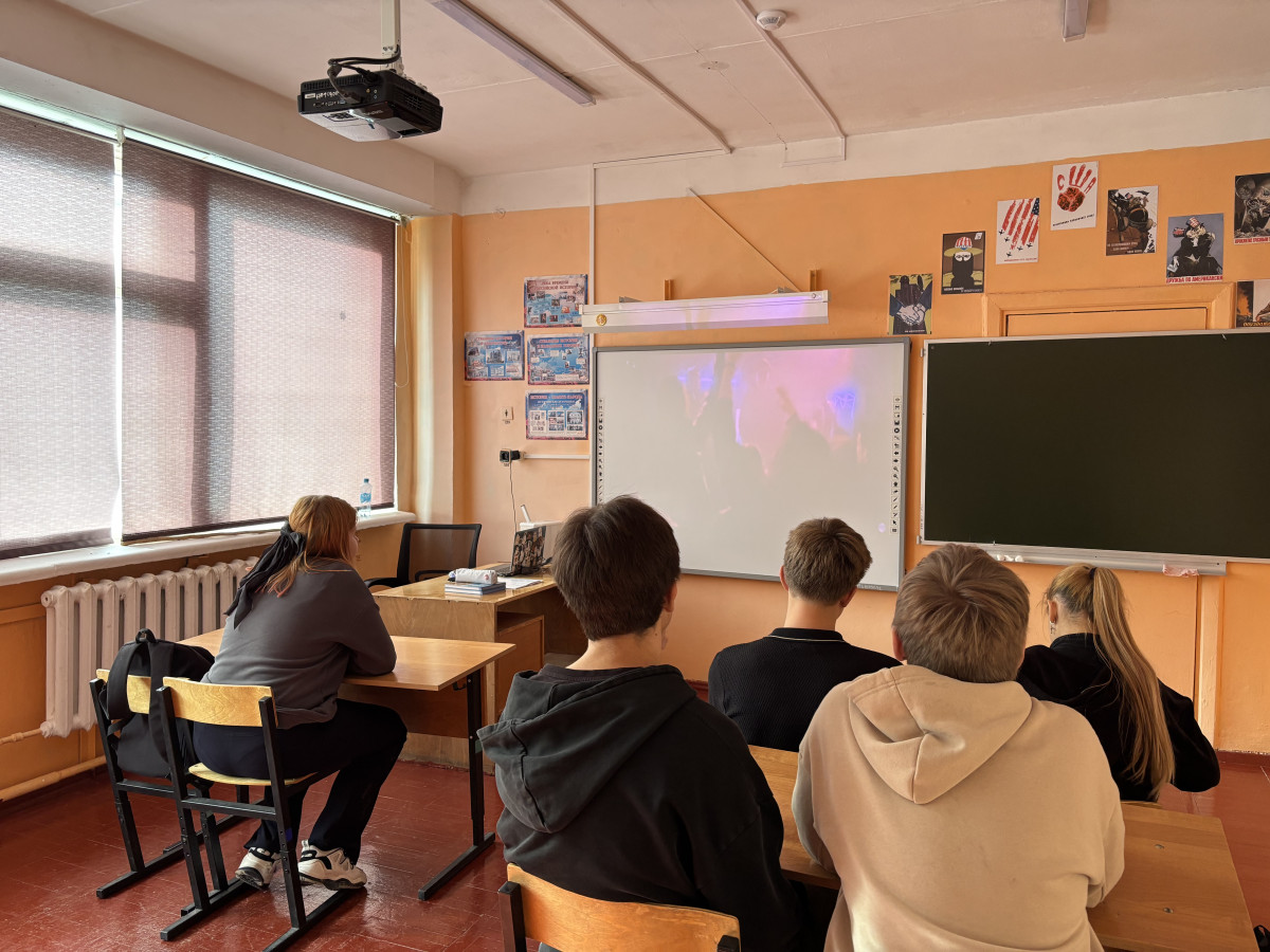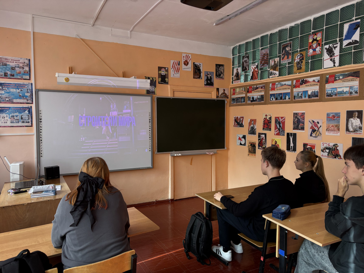 В октябре,в рамках Междунородного культурно-гуманитарного проекта " О будущем",реализующего систему воспитания"Киноуроки в школах России и мира",ученики 9 класса посмотрели корткометражный фильм "Строители мира".