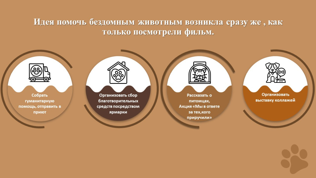 Стремление следовать за героем, перенимая его качества привело к идее изучения проблемы бездомных животных создания коллажа «Мой питомец», предпринимательскую жилку развивать и поддерживать позволила идея организовать благотворительную ярмарку в школе с целью сбора средств для приюта животных «ПИФ».