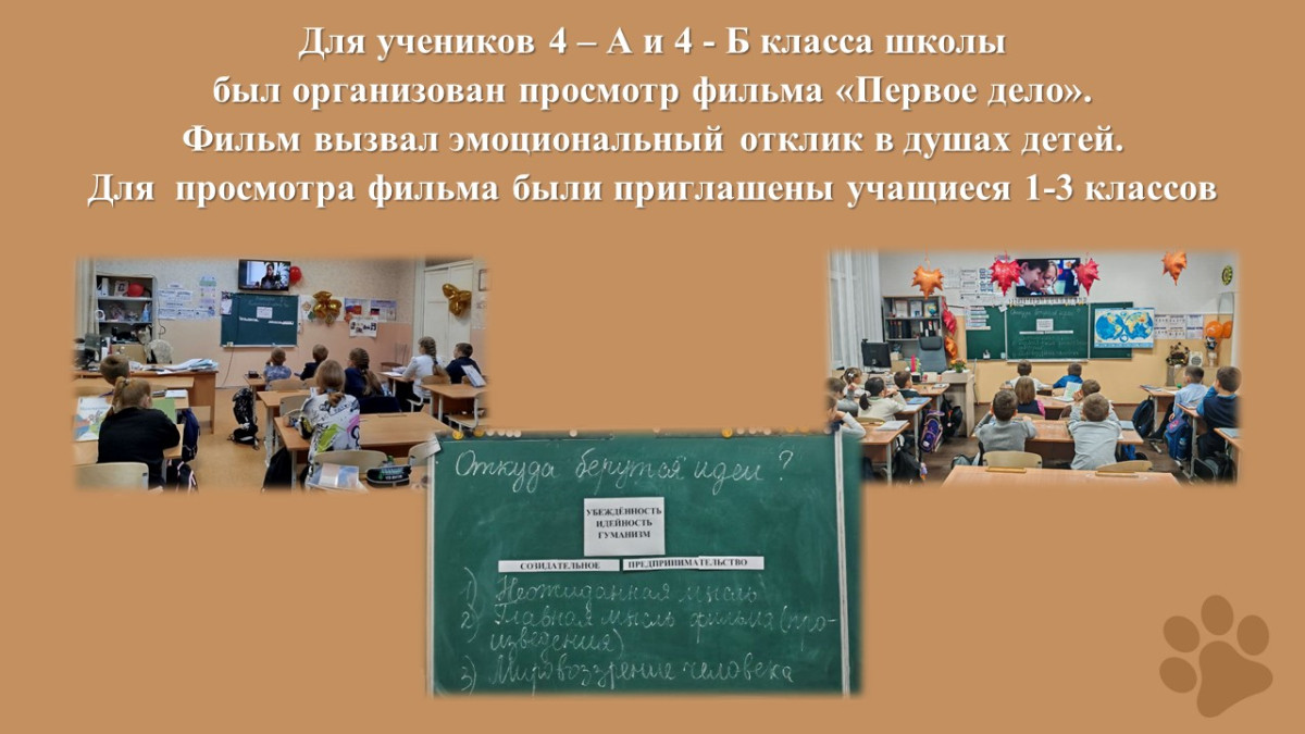 1. Для учеников 4 – А и 4 - Б класса ГБОУ «Школа № 136 г.о. Донецк» ДНР был организован просмотр фильма «Первое дело». Фильм не оставил равнодушным ни одного ребенка, вызвал отклик в душах и сердцах четвероклассников. К просмотру фильма были приглашены учащиеся 1-3 классов.