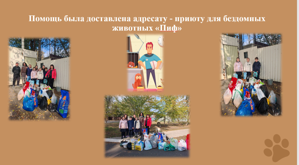Оказание же помощи нуждающимся и обделенным уже стало неотъемлемой частью нашего существования. Дети готовы отдавать частицы своего душевного тепла всем, кто рядом. Помощь, собранная силами детей школы, была отправлена в приют.