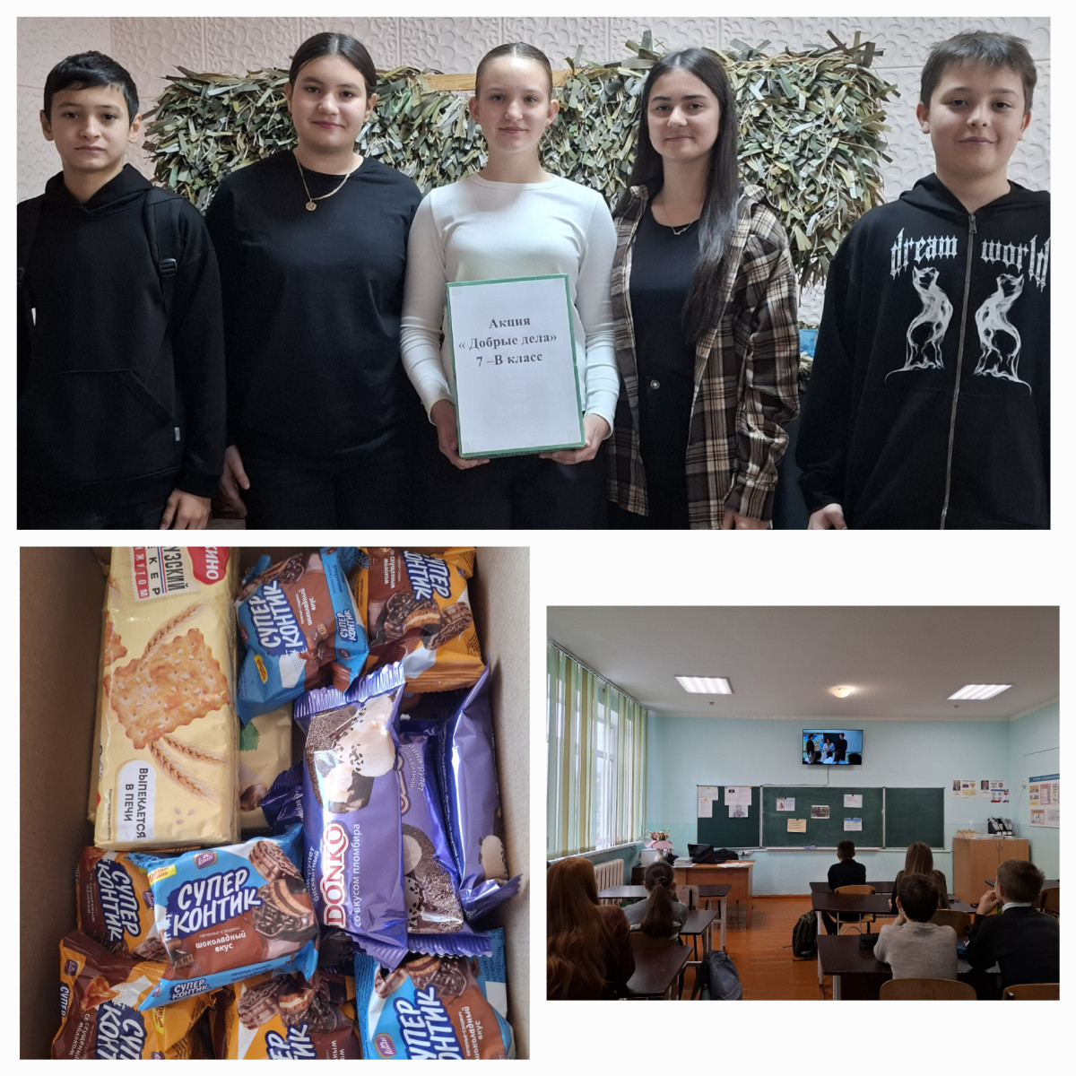 Обсудив фильм, учащиеся , так же как и главный герой, захотели сделать добрый поступок и принять участие в акции « Добрые дела», в поддержку российских солдат, находящихся на СВО . К участию были привлечены учителя, родители, которые всегда принимают активное участие в благотворительных акциях, предложенных детьми. На собранные средства ребята купили сладости и передали свою посылку волонтерам СВО.