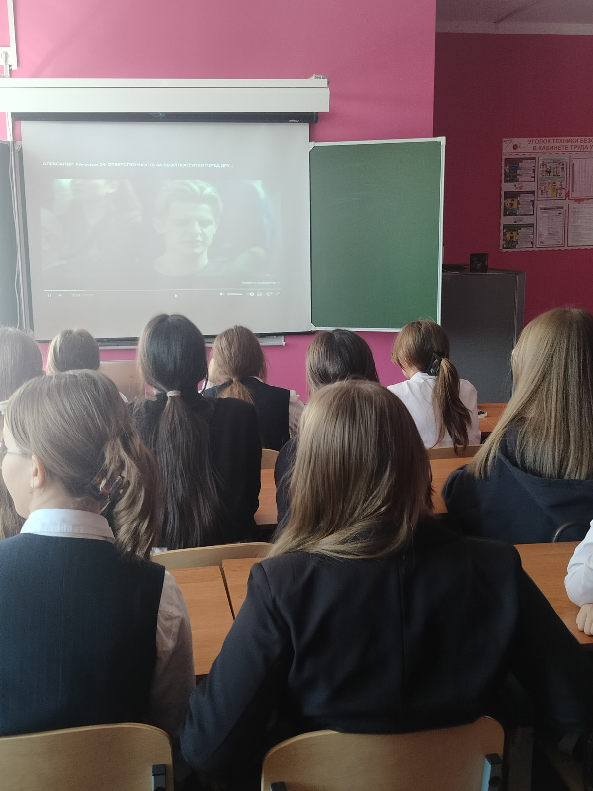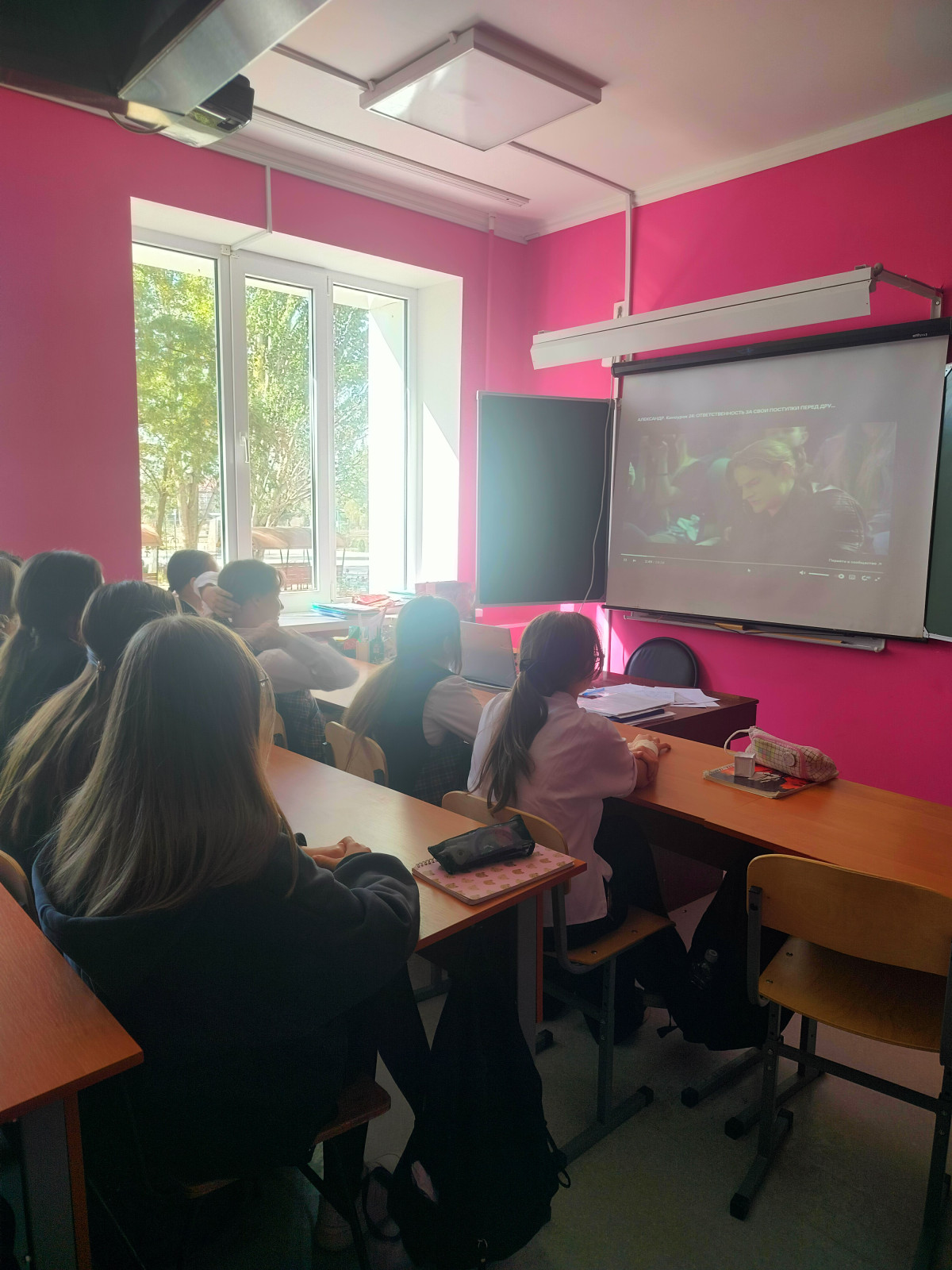 В рамках Всероссийского проекта ,, Кино уроки в школах России " Обучающиеся 8-го класса посмотрели фильм,, Александр " После просмотра, ребята осудили фильм, дали характеристику главным героям, высказали своё мнение, а самое главное, разобрались, что значит быть ответственным перед семьёй, быть полезным обществу, быть в ответе за тех, кого приручили.