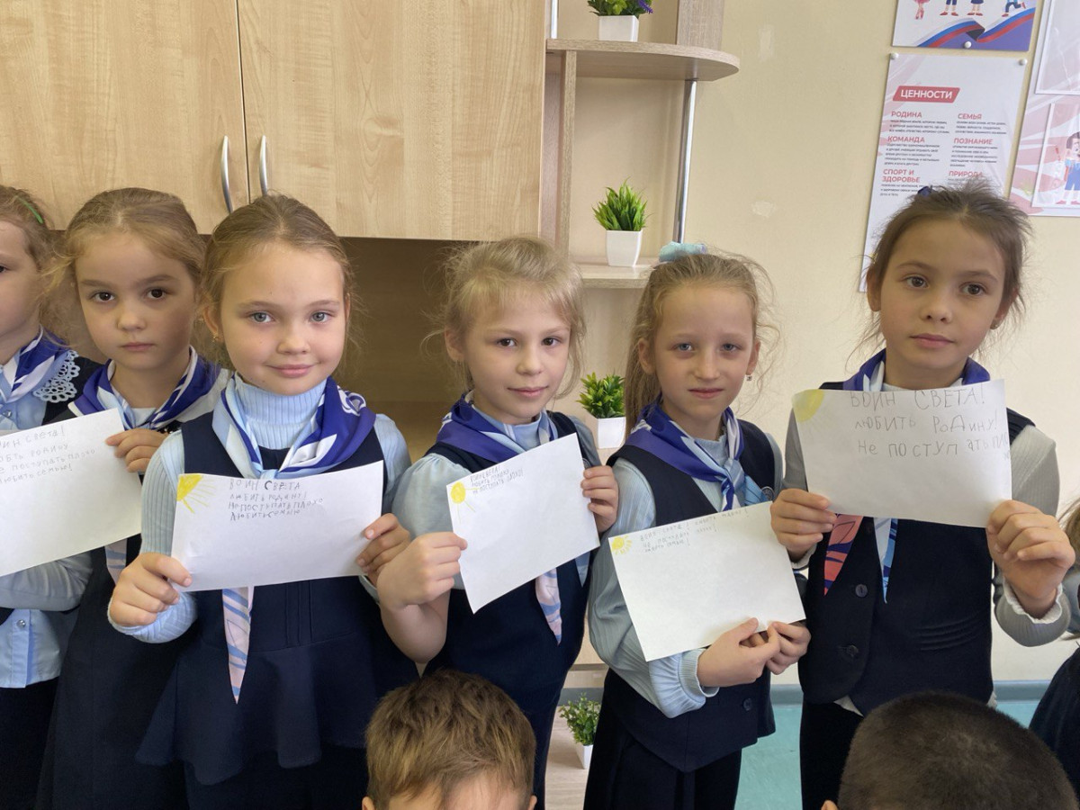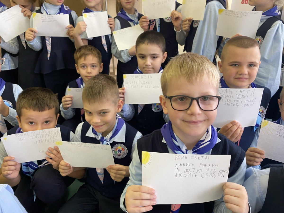 Учащиеся 1Е класса просмотрели фильм "Воин света". После просмотра ребята дали характеристику героев ,обсуждая их поступки. Они высказали своё мнение кто из героев правильно поступил ,а кто- нет. В ходе обсуждения учащиеся сделали вывод: кого можно назвать "Воин света". Они выделили главные качества "Война света" и их записали:"Любить Родину! Не поступать плохо!Любить семью!"Ребята объяснили,что значит любить Родину-это гордиться своим городом,страной,где ты родился, любить семью -это гордиться своими родными,помогать им, не поступать плохо-это ,когда родные и окружающие тебя люди гордятся тобой.Первоклассники рассказали и показали фотографии,как осенью помогали своим родным собирать урожай.