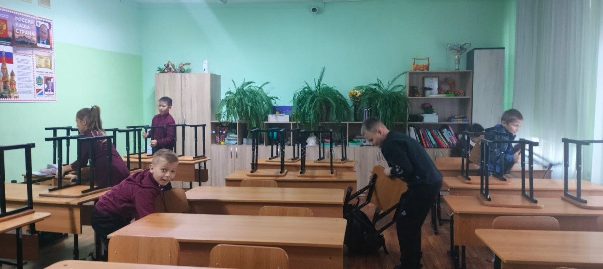 Всем известно, что труд технического работника в школе – дело нелегкое, занимает время и силы. А если ребята помогут поднять стулья и навести порядок в кабинете, это сколько времени займет? Работа закипела. Через несколько минут в кабинете стояли стройные ряды парт и стульев, ни одной бумажки!