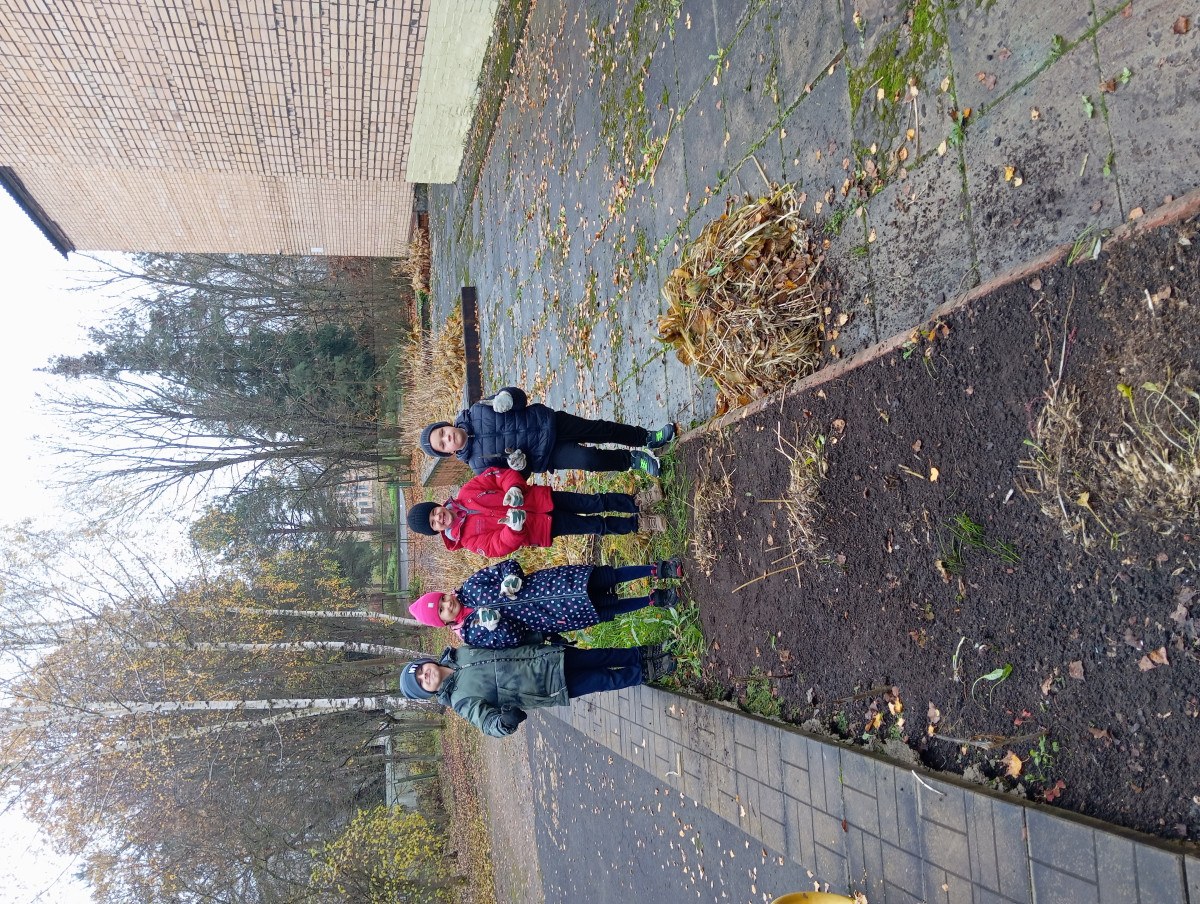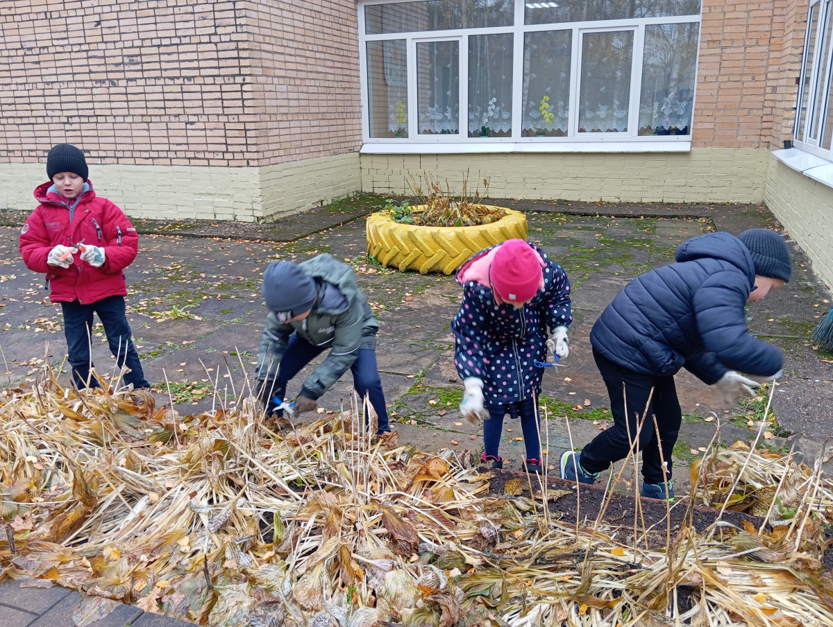 История перевоспитания Кирилла началась с того, что он выбросил банановую шкурку за окно. Поэтому в качестве социальной практики первоклассники решили убраться на пришкольной территории. Ведь они уже знают, что природу надо охранять и защищать. Они убрали старую листву с клумбы под окнами школы.