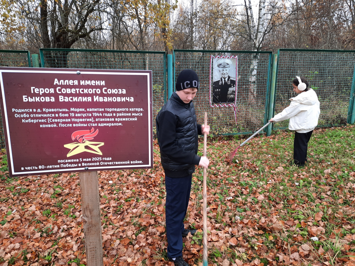 Вдохновлённые фильмом и историей земляка-героя, учащиеся 9 класса решили ухаживать за аллеей. Осенью они подготовили её к зиме: убрали опавшую листву, пропололи сорняки вокруг молодых саженцев фруктовых деревьев и подкормили их удобрениями.